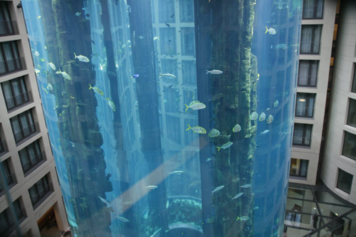 Niet zo bescheiden is het aquarium in de lobby van het Radisson Blu hotel in Berlijn.