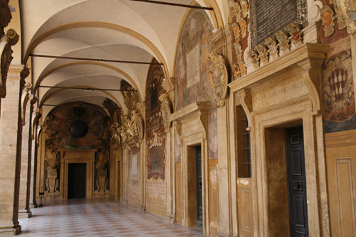 Het medium natuurlijk wel, maar het idee om contacten te onderhouden, jezelf te verbinden aan bepaalde groepen en je talenten te etaleren, is niks nieuws. Dat doen ze al eeuwen, zoals bijvoorbeeld in Bologna. Daar staat de oudste, nog functionerende universiteit ter wereld (gesticht in 1088). In het ‘Palazzo dell’Archiginnasio’, in 1562 opgeleverd als de eerste centrale zetel van de universiteit, vind je een hele verzameling van deze wapenschilden.