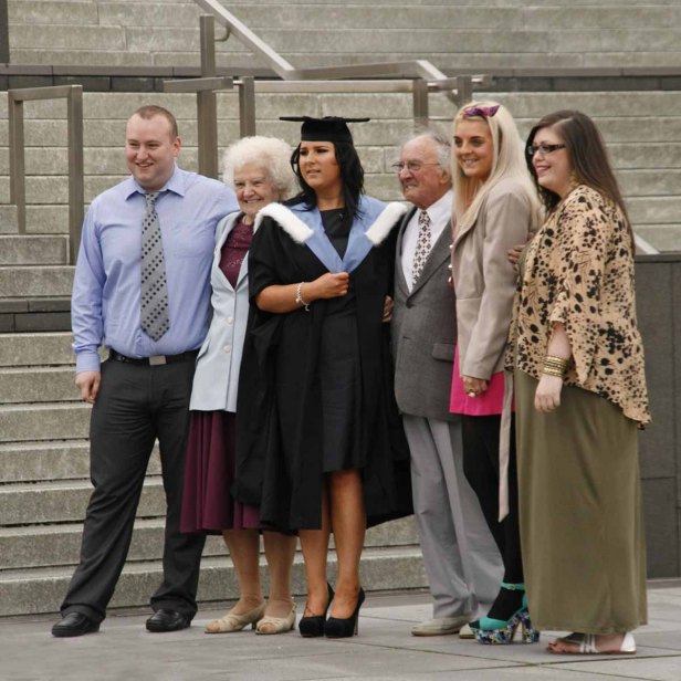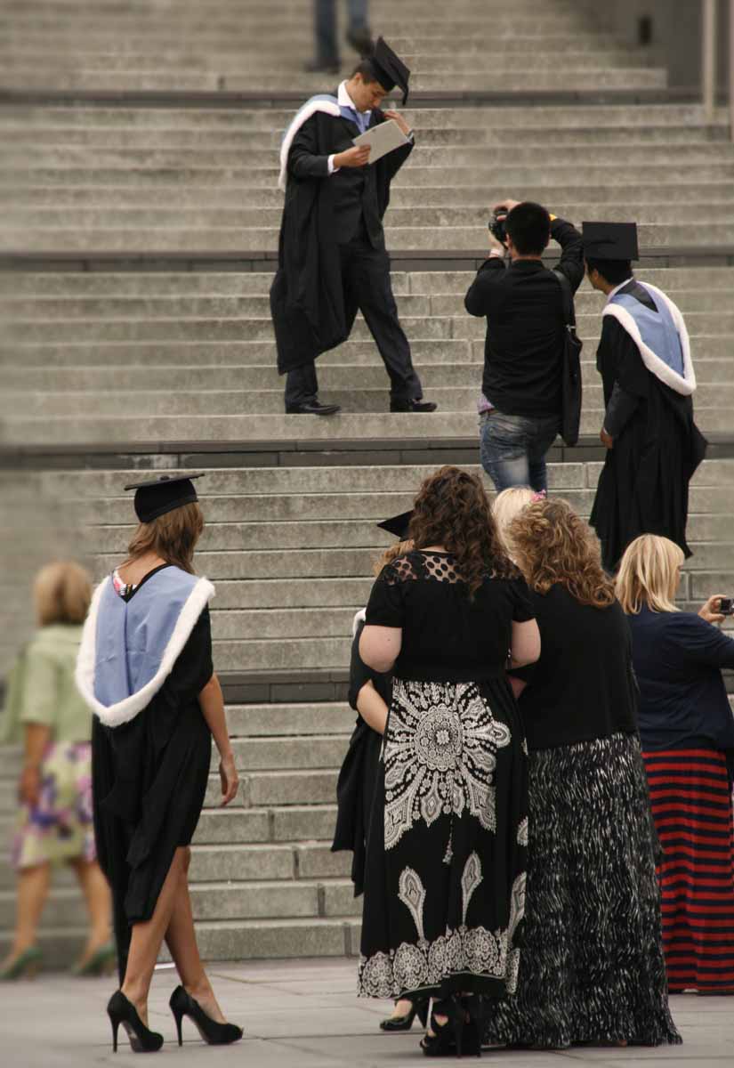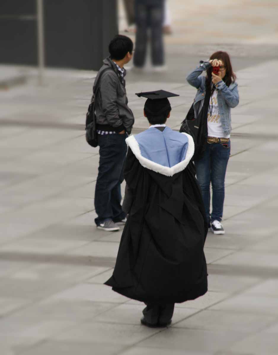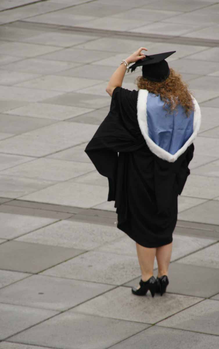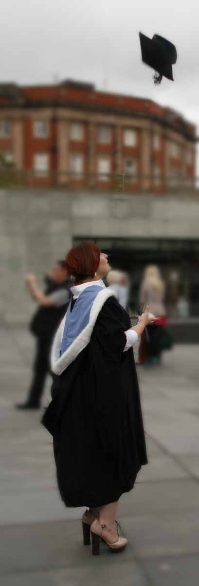 Vorig jaar rond deze tijd was ik in Liverpool en toen was het kennelijk net de tijd van het jaar dat studenten iets te vieren hadden. En dat deden ze zo, dat het niemand kon ontgaan. Leuk om te zien hoe de studenten in uniform over straat lopen, zo zwierig mogelijk wapperend met hun gewaad. Elkaar fotograferen en met de hele familie, die natuurlijk ook op zijn paasbest is uitgedost, op de gevoelige plaat. En dan de enorm hoge hakken van de dames: ze konden er niet allemaal even goed op lopen, maar platte schoenen zijn blijkbaar echt ‘not done’ bij zo’n gelegenheid. Zou je ook een ‘degree’ in lopen op ‘high heels’ kunnen halen?