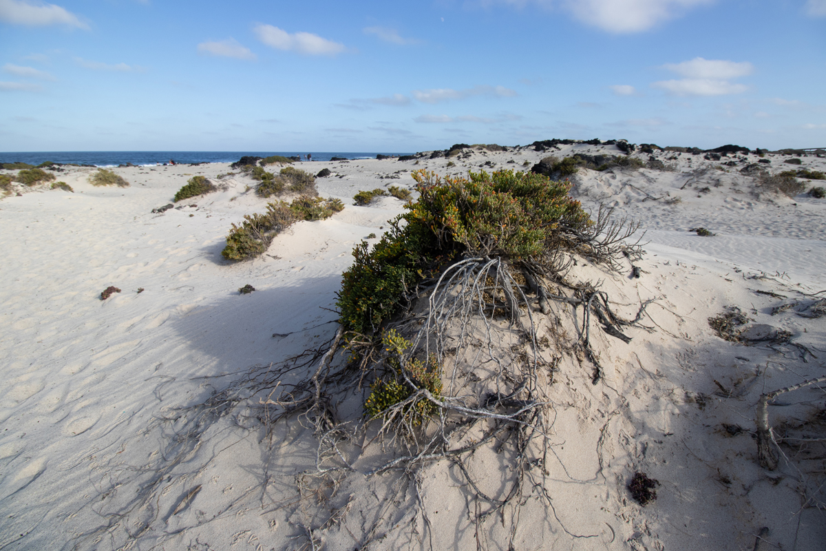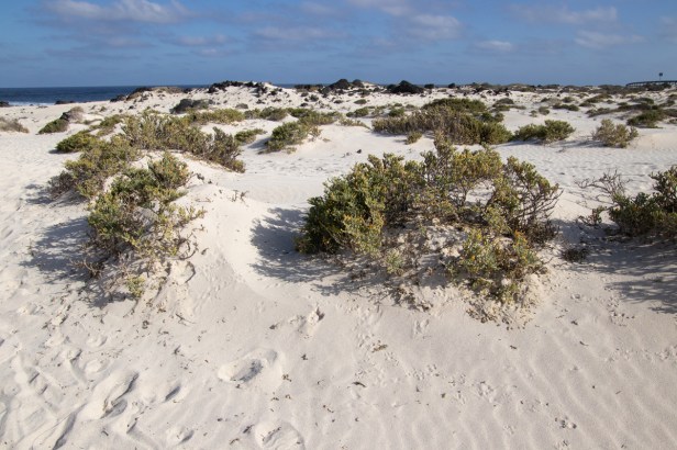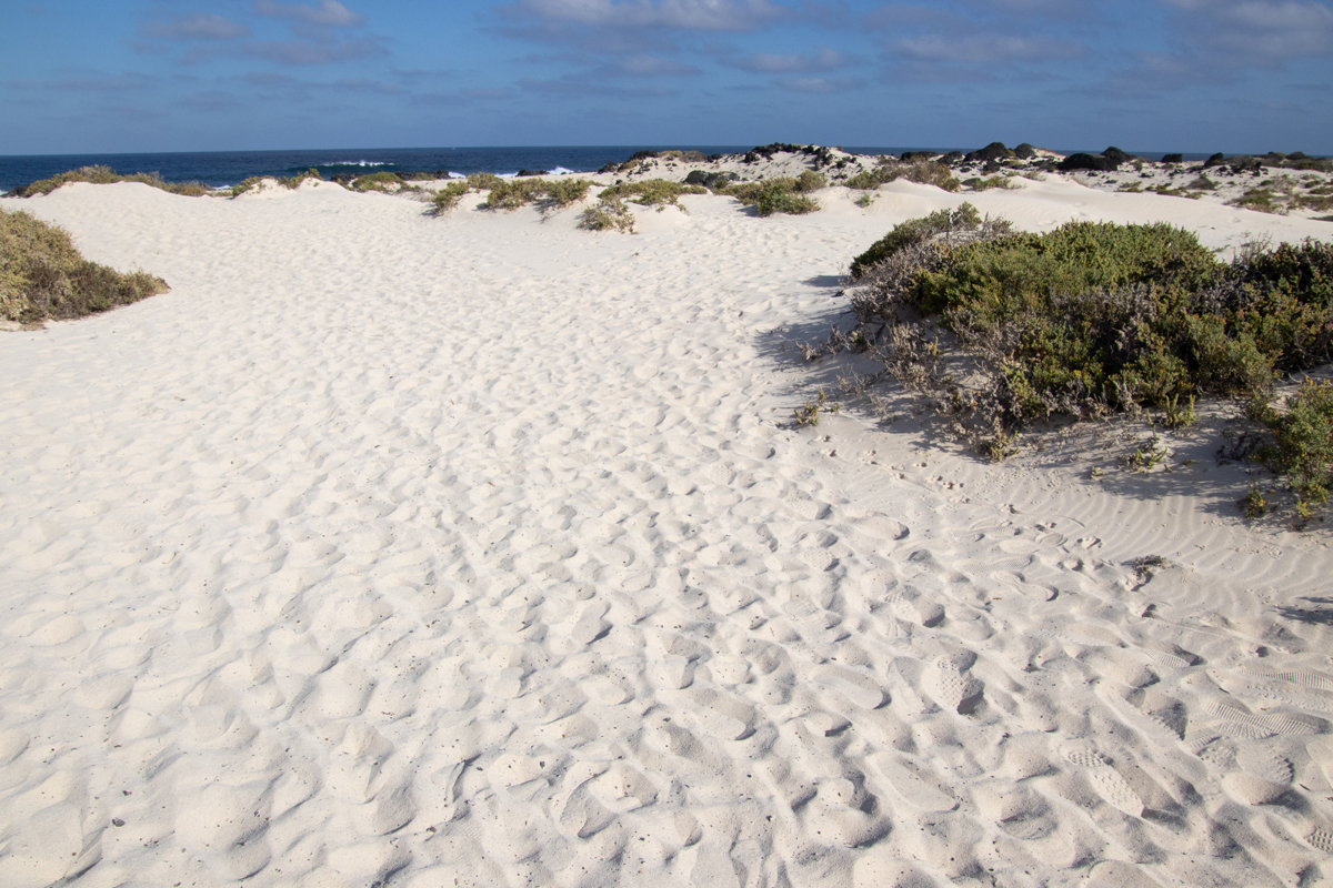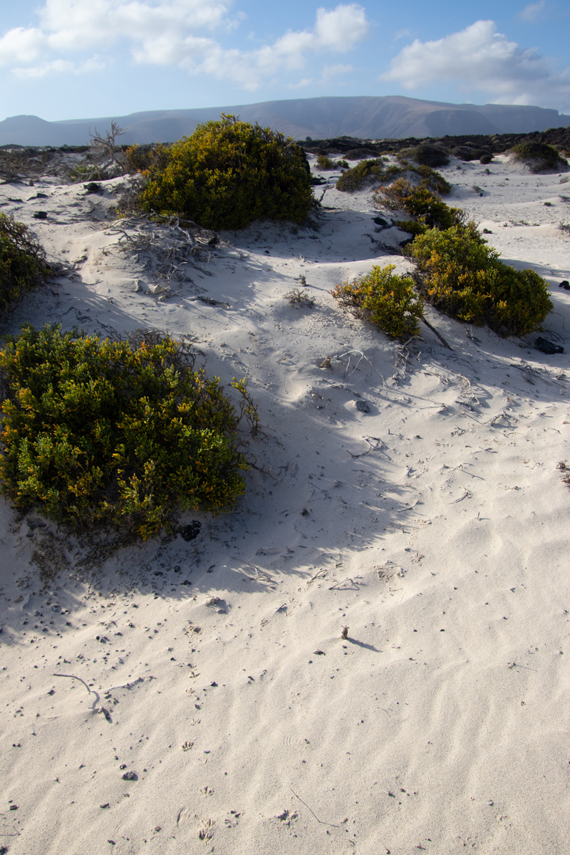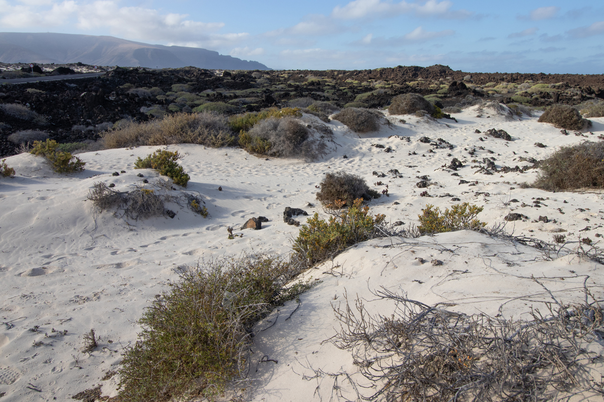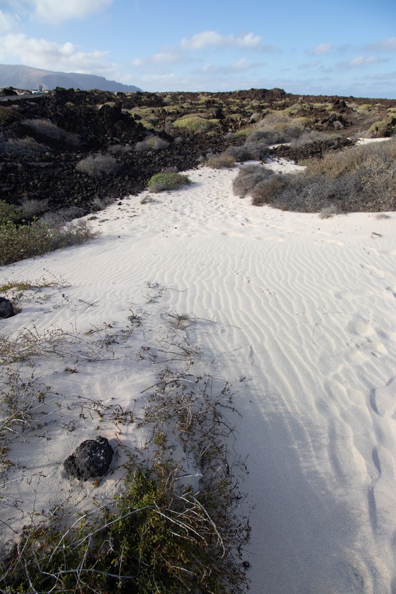 Het eiland Lanzarote is grotendeels bedekt met zwarte lava. Ook de stranden zijn zwart, soms bestaand uit fijn zwart lavazand, soms uit grotere brokken lava. Het is daarom heel verrassend om ineens een wit zandstrandje tegen te komen. Dit strandje, ‘Caleta de mojon blanco’ is niet zo groot, maar wel bijzonder om te zien. Een witte plek tussen al het zwart. De golven zijn er, zoals overal op Lanzarote, spectaculair.
