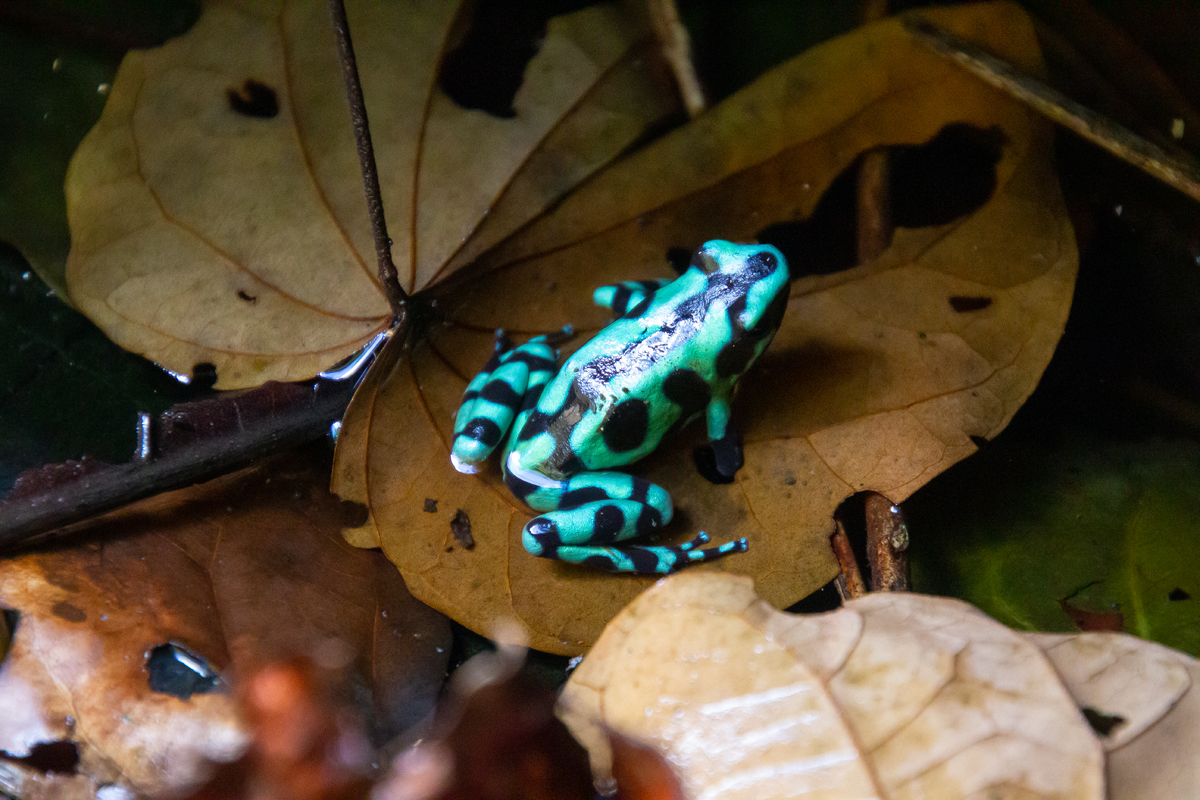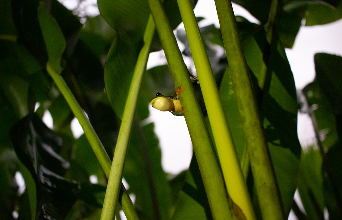 Maar de omstandigheden waren lastig, dus er waren niet heel veel goede foto’s bij. Des te leuker was het dat we een paar dagen later bij daglicht een park bezochten, waar een gids voor ons de kikkertjes opzocht. Ergens een wonder dat dat lukte – de goede man roerde verwoed met een stok door de bladeren, je zou als kikker van minder op de vlucht slaan – maar we hebben verschillende soorten gezien en kunnen vastleggen. Zijn ze niet net van rubber?
