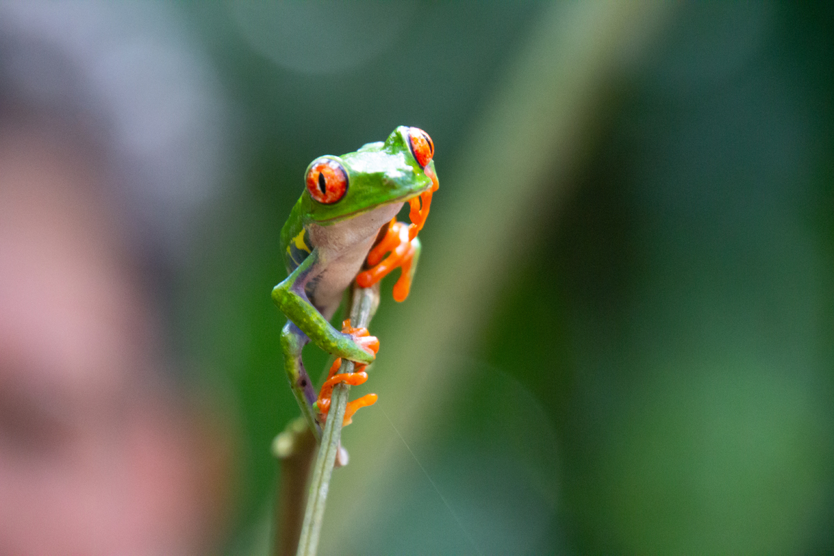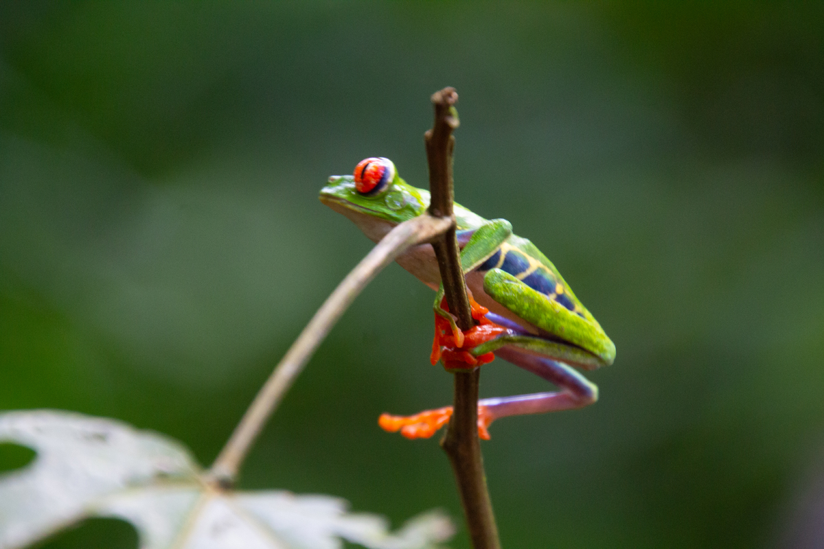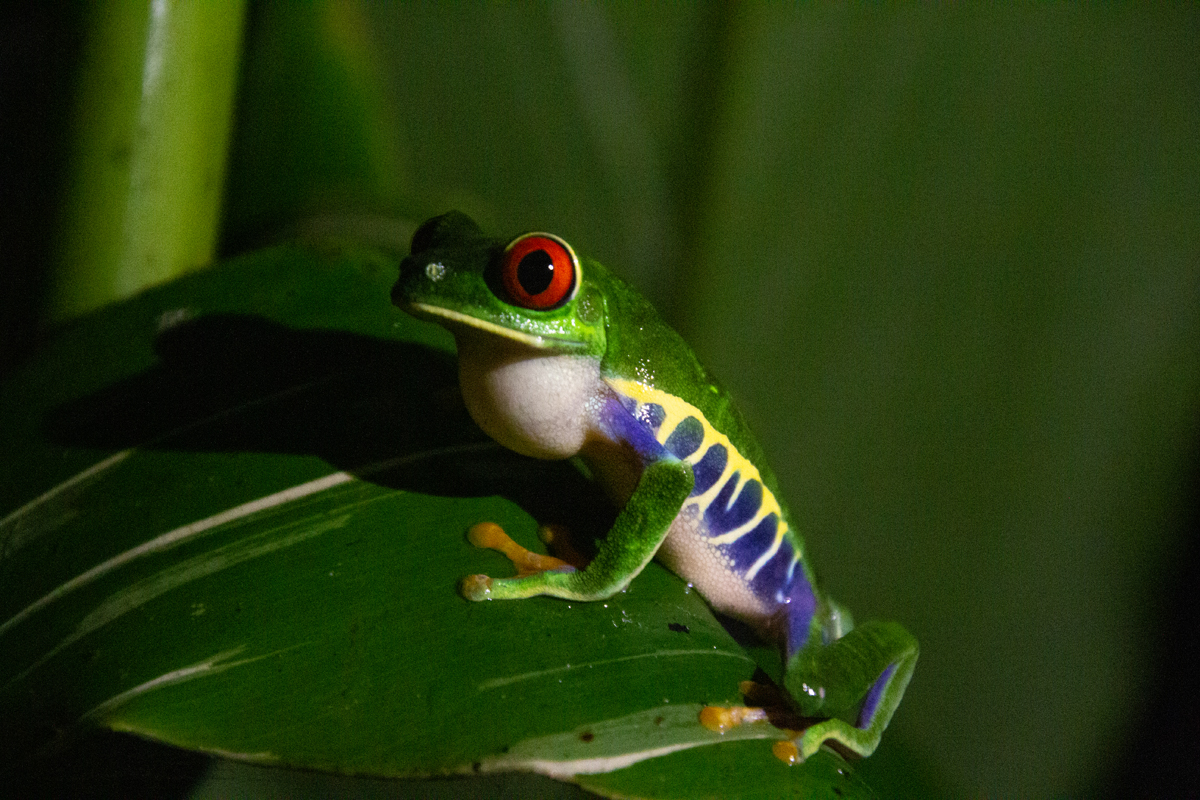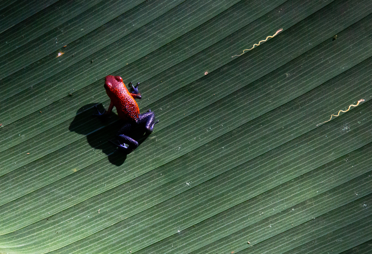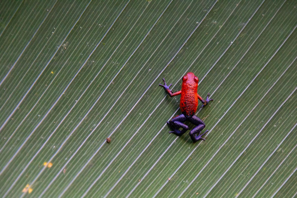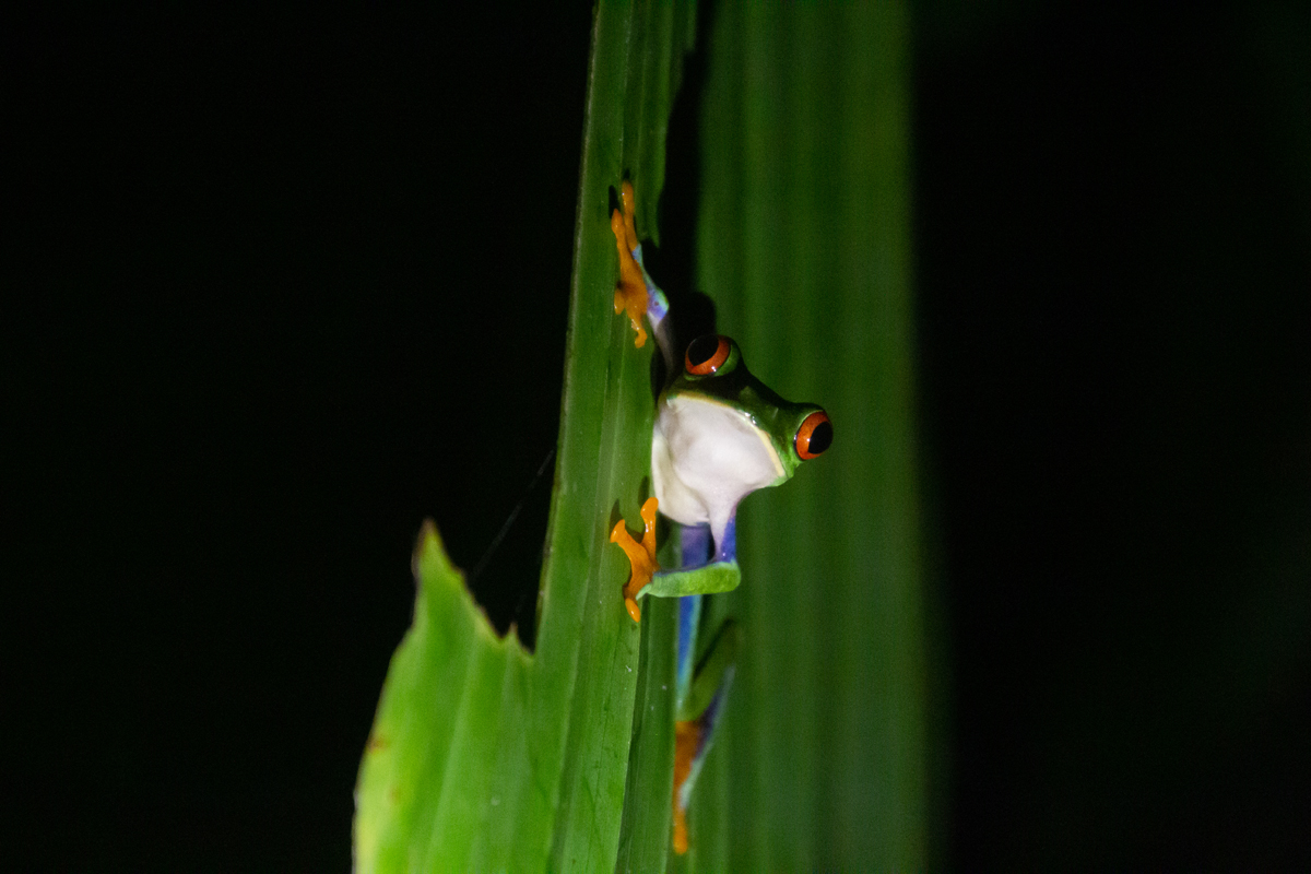 Voordat ik ergens naar toe ga, heb ik vaak wel een wens wat ik op de foto wil zetten. Voor Costa Rica had ik de wens om zo’n bijzonder gekleurd mini-kikkertje te fotograferen. De eerste kans deed zich al snel voor, tijdens ons verblijf in Tortuguero. Op het terrein van onze accomodatie was een kikkertuin, waar je in de avond kikkers kon gaan zoeken tussen het groen. Het was aardedonker en het goot van de regen toen wij met z’n tweeën de tuin in gingen. Het was even speuren, maar we vonden er een paar. Carlo verlichtte het kikkertje met zijn telefoon, ik maakte de foto’s.