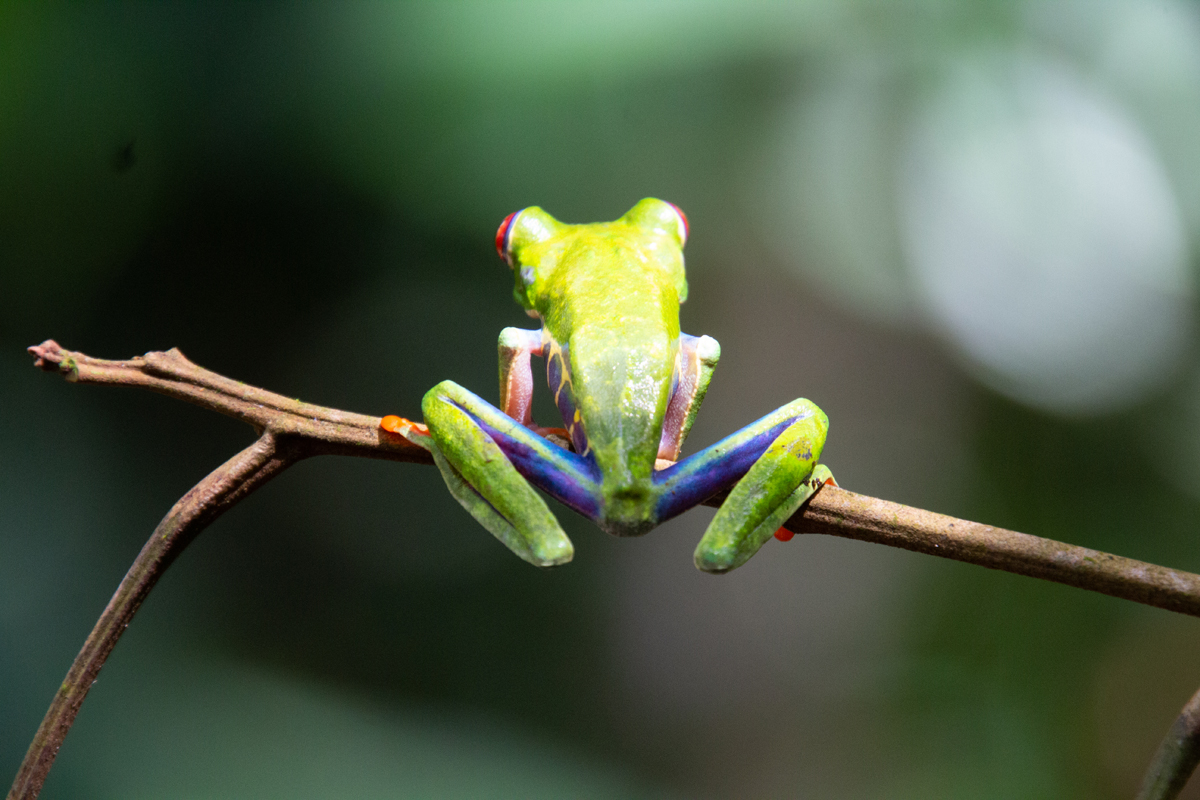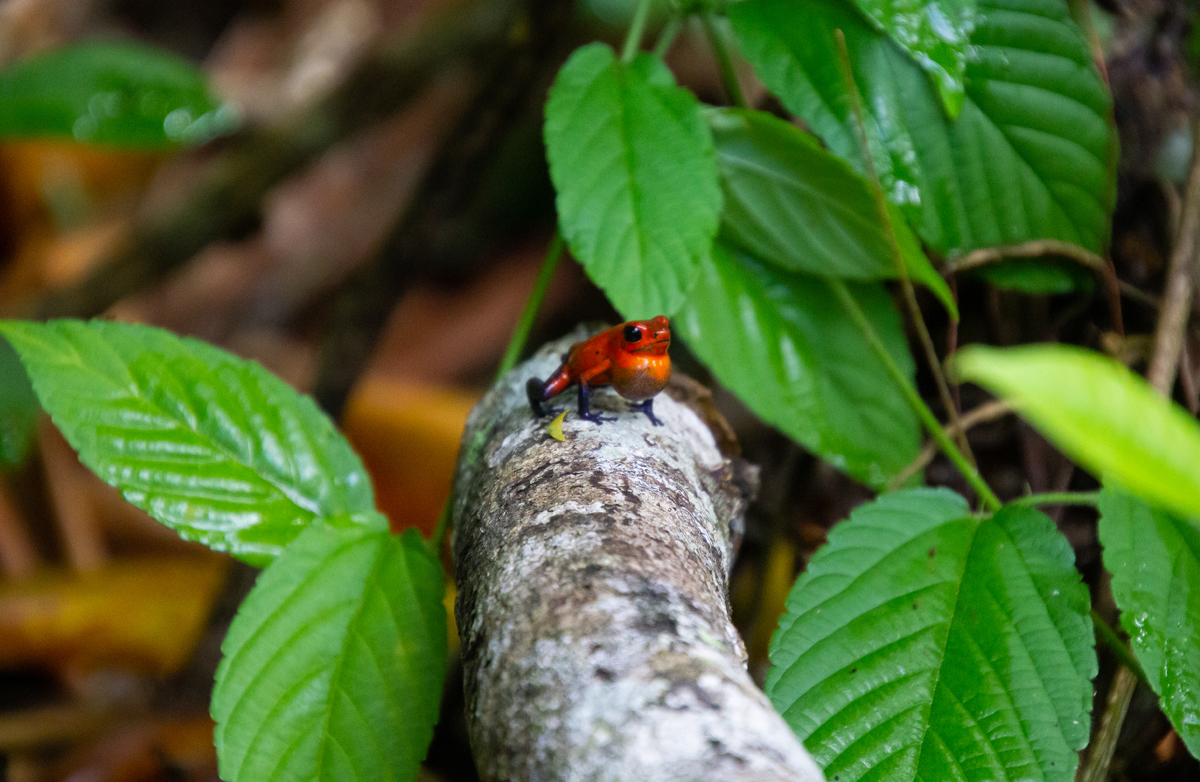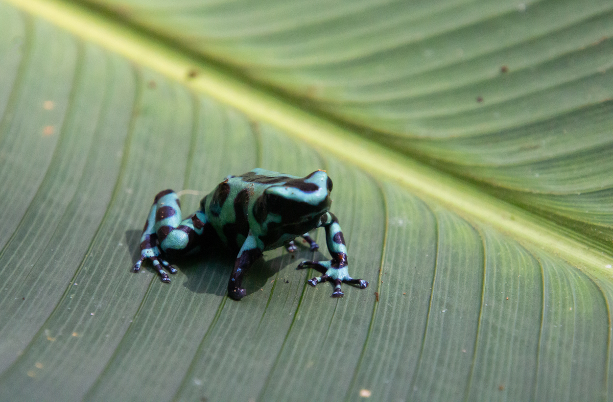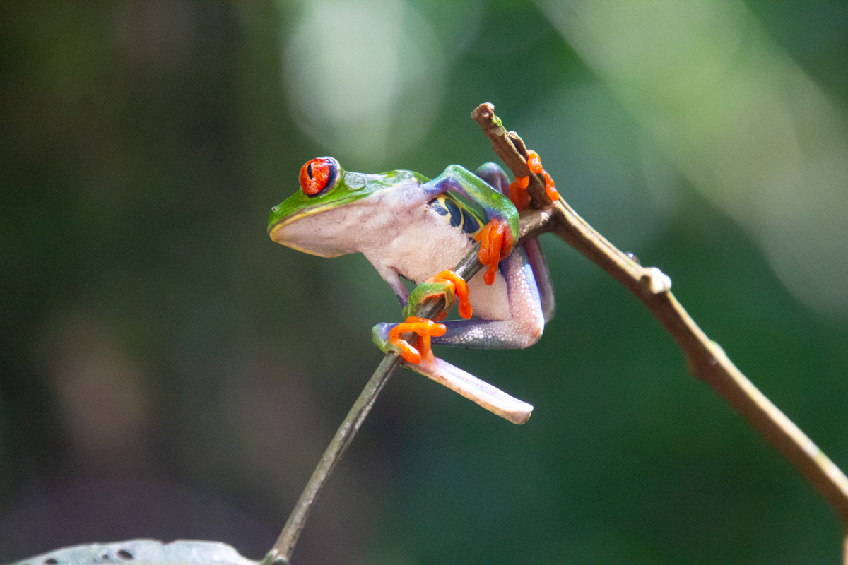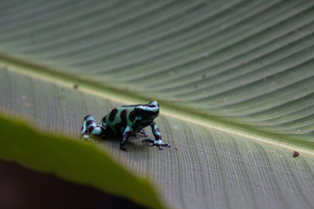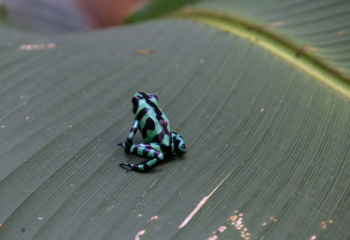 Voordat ik ergens naar toe ga, heb ik vaak wel een wens wat ik op de foto wil zetten. Voor Costa Rica had ik de wens om zo’n bijzonder gekleurd mini-kikkertje te fotograferen. De eerste kans deed zich al snel voor, tijdens ons verblijf in Tortuguero. Op het terrein van onze accomodatie was een kikkertuin, waar je in de avond kikkers kon gaan zoeken tussen het groen. Het was aardedonker en het goot van de regen toen wij met z’n tweeën de tuin in gingen. Het was even speuren, maar we vonden er een paar. Carlo verlichtte het kikkertje met zijn telefoon, ik maakte de foto’s.