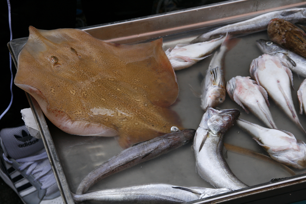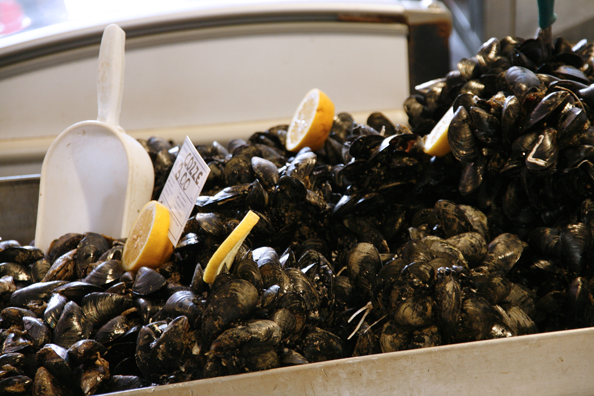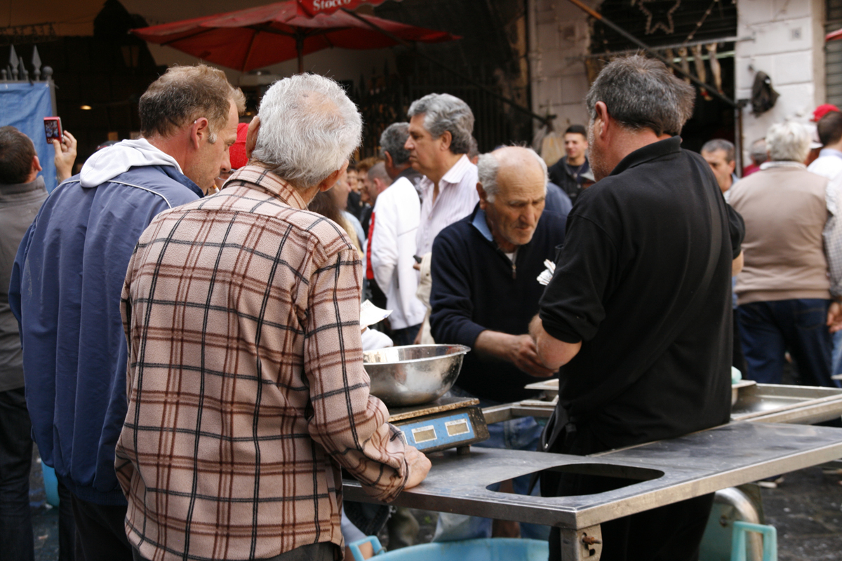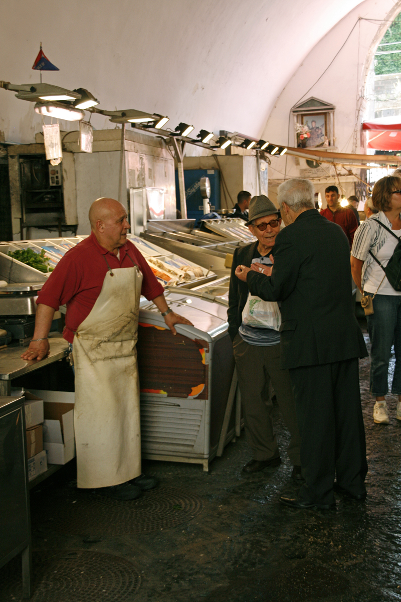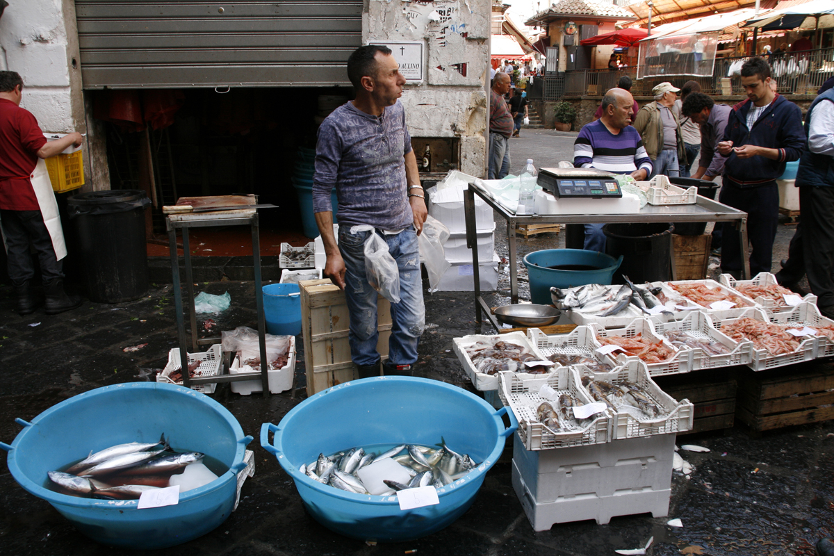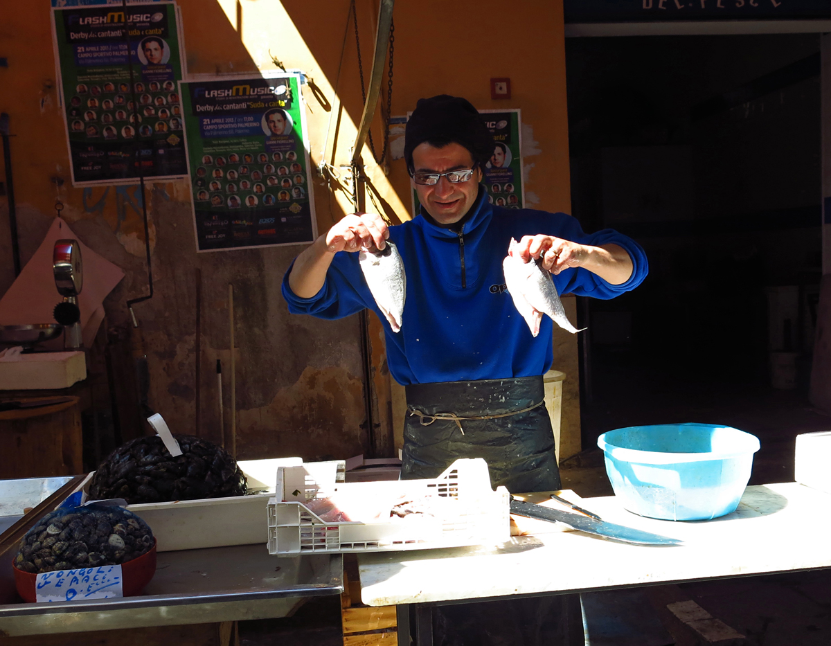 Vis en andere wezens uit de zee vormen een belangrijk onderdeel van de Italiaanse keuken. Het best koop je het natuurlijk op de markt, waar je goed kunt zien of het vers is allemaal. Deze foto’s maakte ik op de markt in Catania. Op de vismarkt in Palermo maakte ik oogcontact met de marktkoopman hierboven, die duidelijk trots was op zijn handelswaar. Op zich houd ik niet zo van dit soort geposeerde foto’s, maar het was een leuk moment en hij stond prachtig in het zonlicht. Dat had hij zelf dan weer niet door, denk ik. En inderdaad, die vlaggetjes bij het stalletjes met stokvis zijn Noors, niet Italiaans. Ook in Italië worden sommige vissen geïmporteerd.