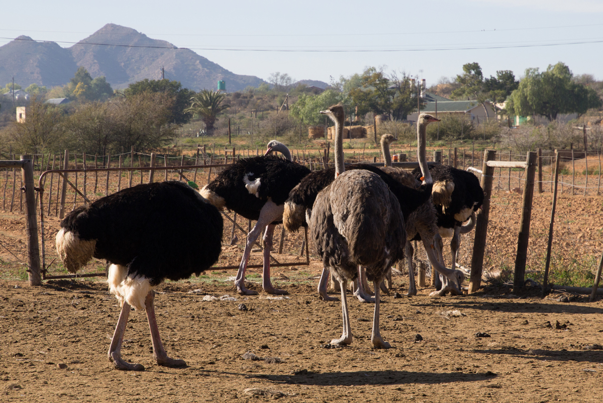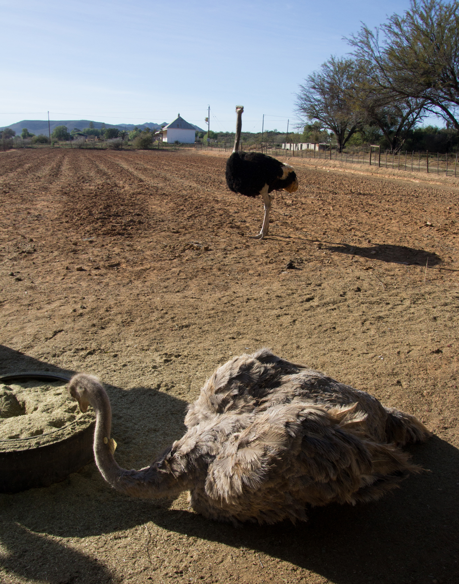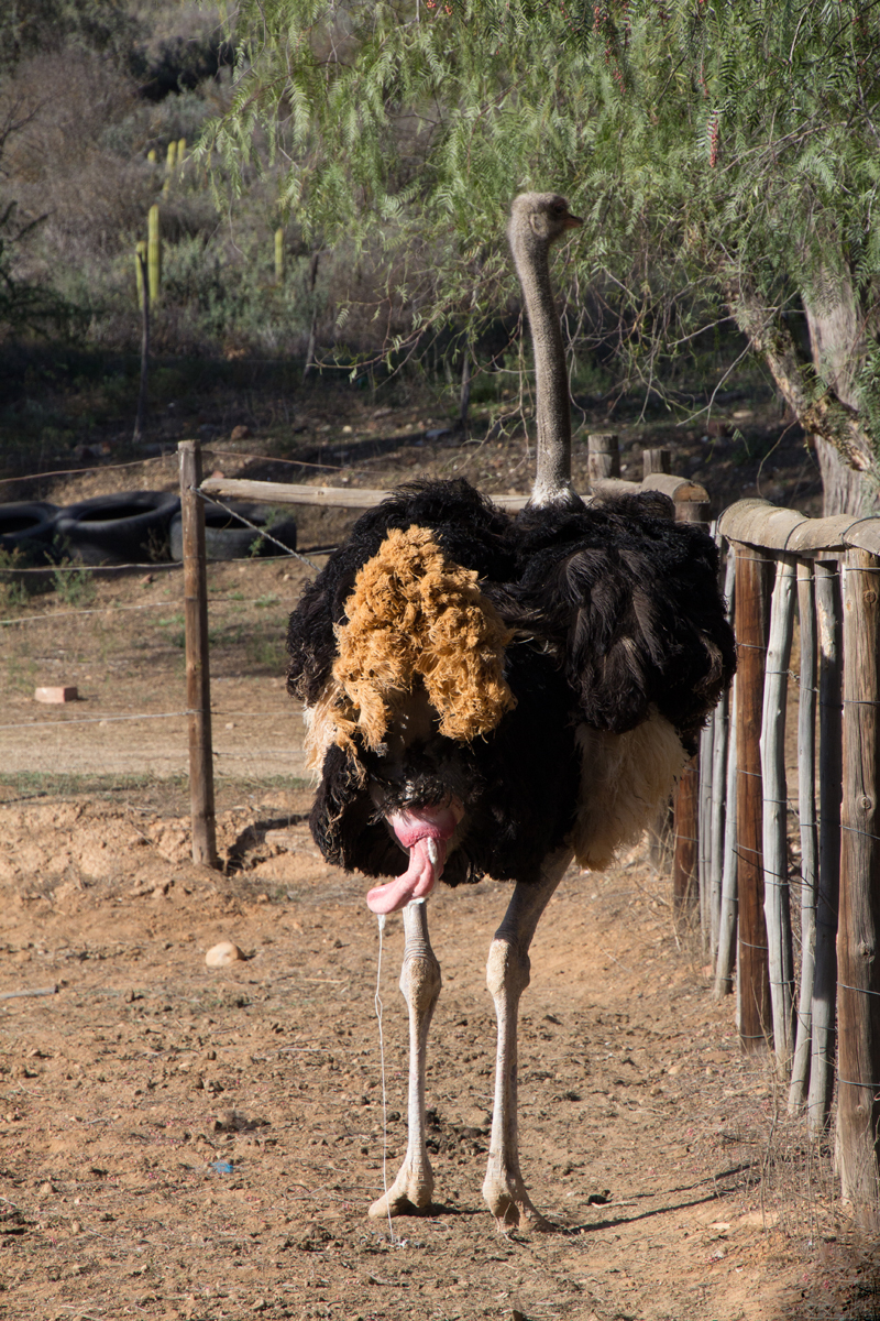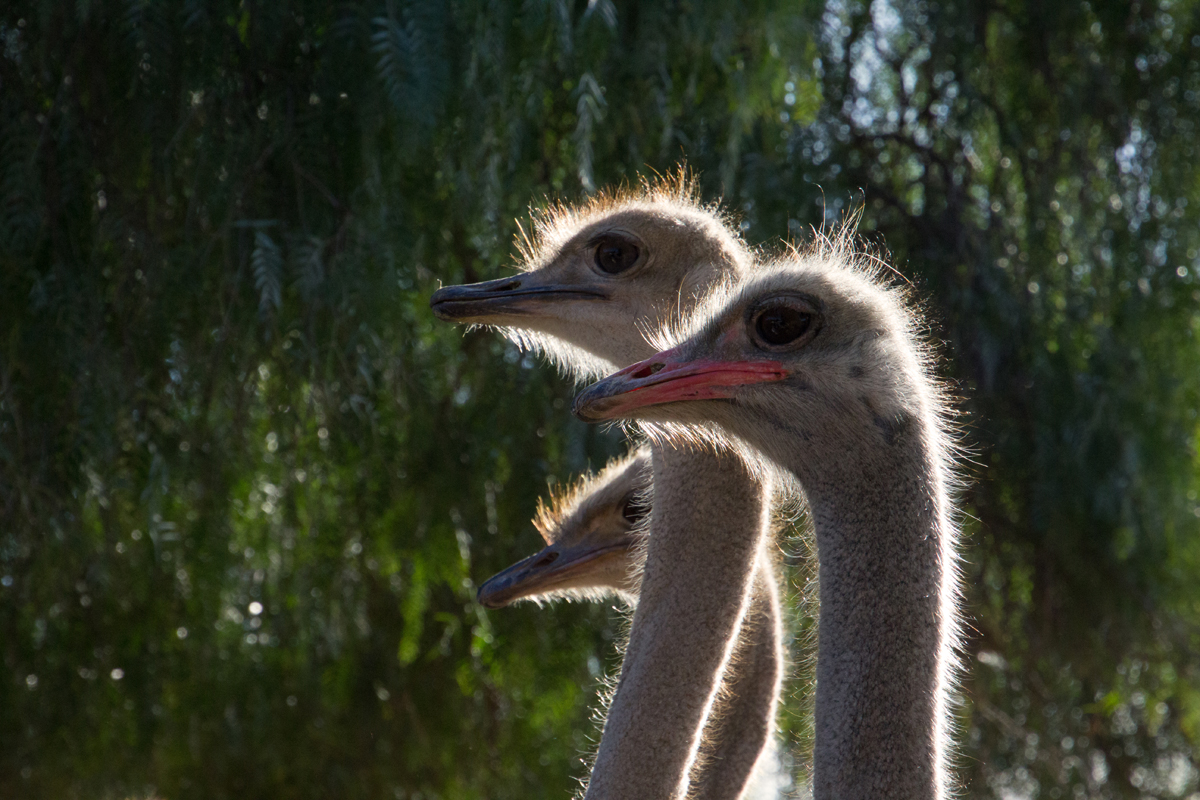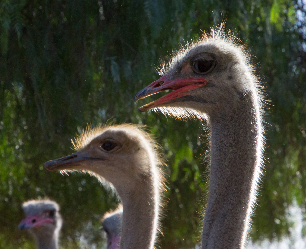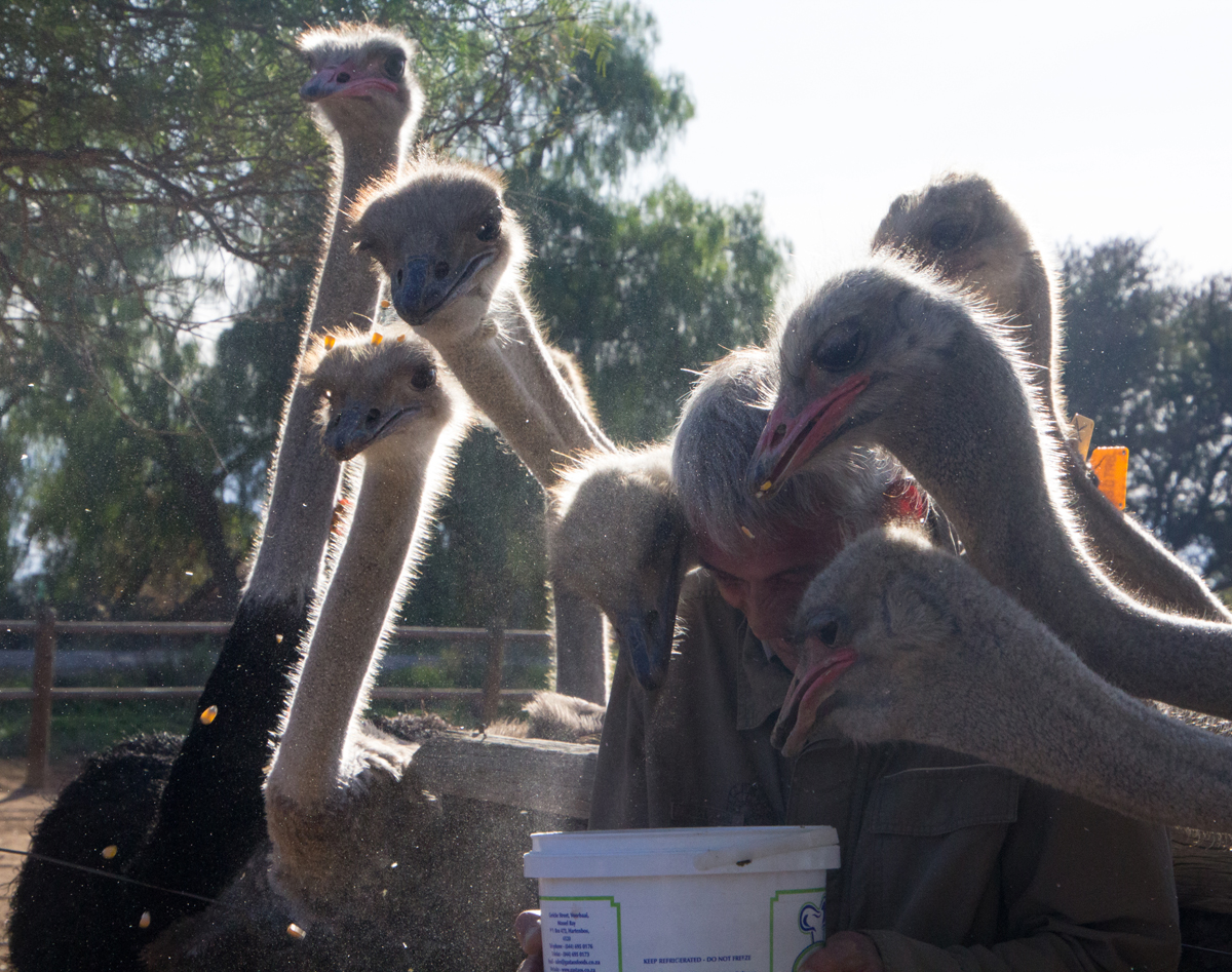 In Zuid-Afrika bezocht ik een struisvogelfarm. Wat een grappige dieren zijn dat van dichtbij. Een van mijn groepsgenoten was de klos om de dieren te voeren. Dat ging als volgt: hij moest zijn bril af doen en kreeg een emmer voer in zijn armen gedrukt. Met zijn rug naar de struisvogels toe moest hij voor het hek gaan staan, waarna de struisvogels binnen een paar seconden ter plekke waren en razendsnel over zijn schouders heen de emmer leeg aten. Blij dat ik niet als ‘vrijwilliger’ was aangewezen, het leek mij helemaal niet prettig, die langsflitsende snavels langs je oren. Al eten ze geen vlees, maar toch…