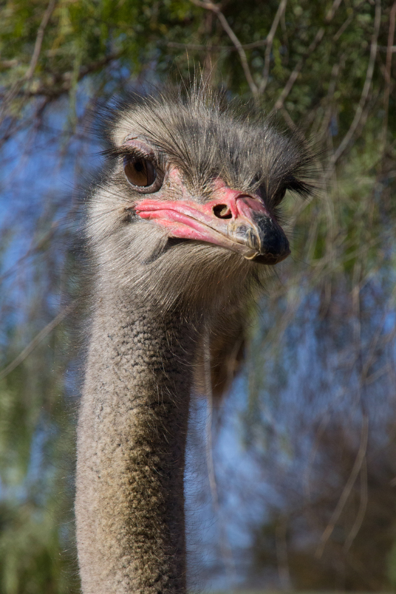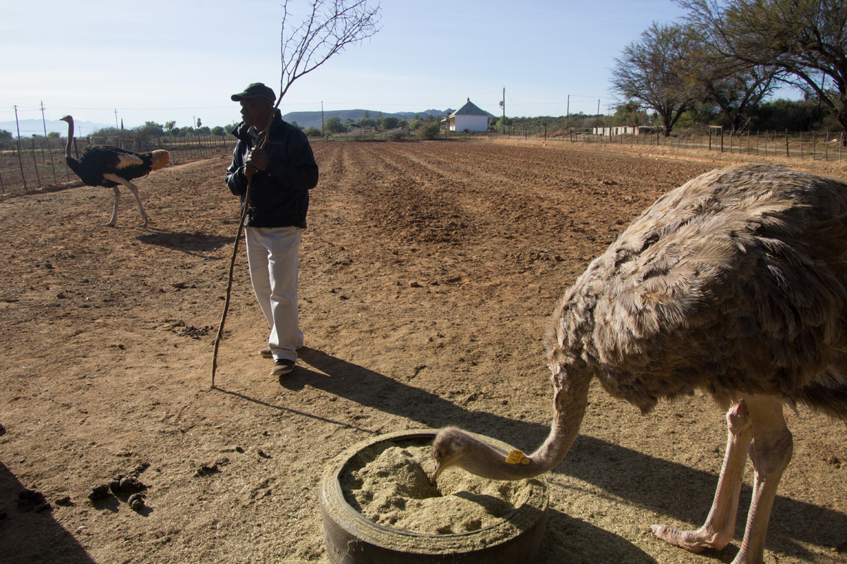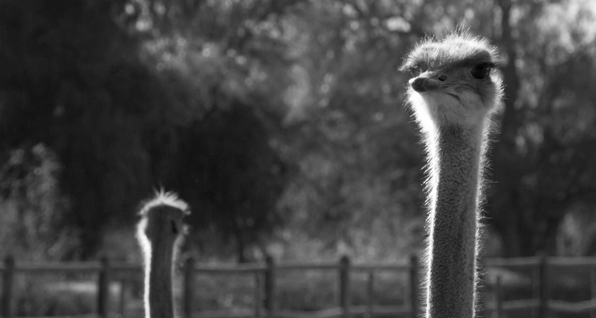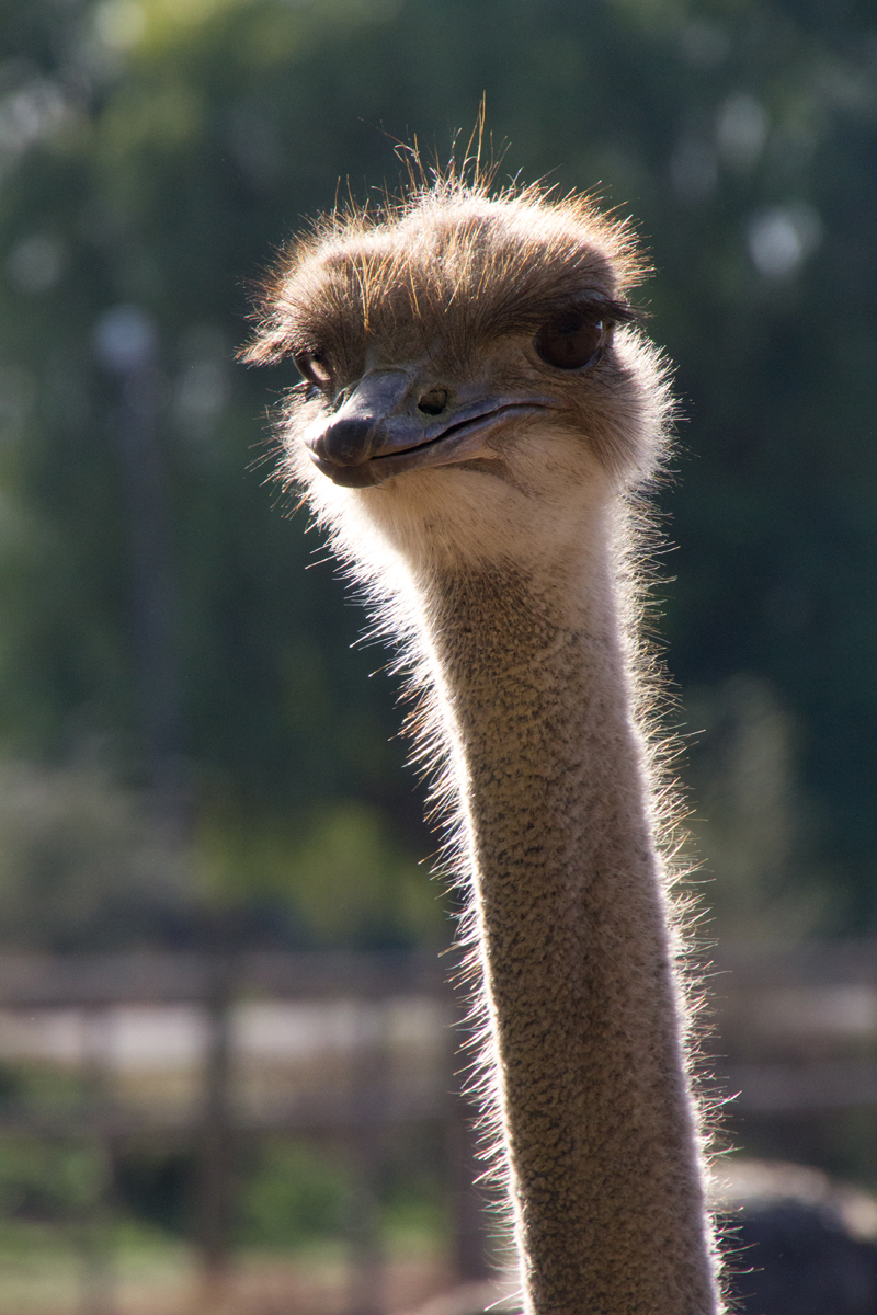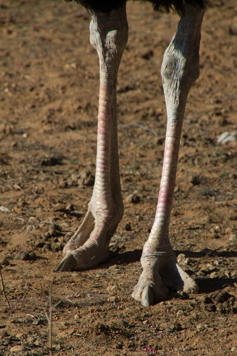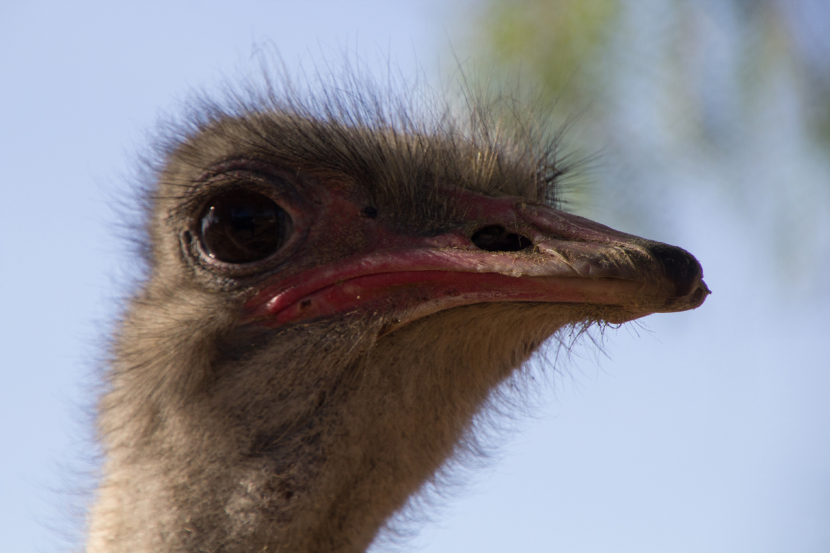 In Zuid-Afrika bezocht ik een struisvogelfarm. Wat een grappige dieren zijn dat van dichtbij. Een van mijn groepsgenoten was de klos om de dieren te voeren. Dat ging als volgt: hij moest zijn bril af doen en kreeg een emmer voer in zijn armen gedrukt. Met zijn rug naar de struisvogels toe moest hij voor het hek gaan staan, waarna de struisvogels binnen een paar seconden ter plekke waren en razendsnel over zijn schouders heen de emmer leeg aten. Blij dat ik niet als ‘vrijwilliger’ was aangewezen, het leek mij helemaal niet prettig, die langsflitsende snavels langs je oren. Al eten ze geen vlees, maar toch…
