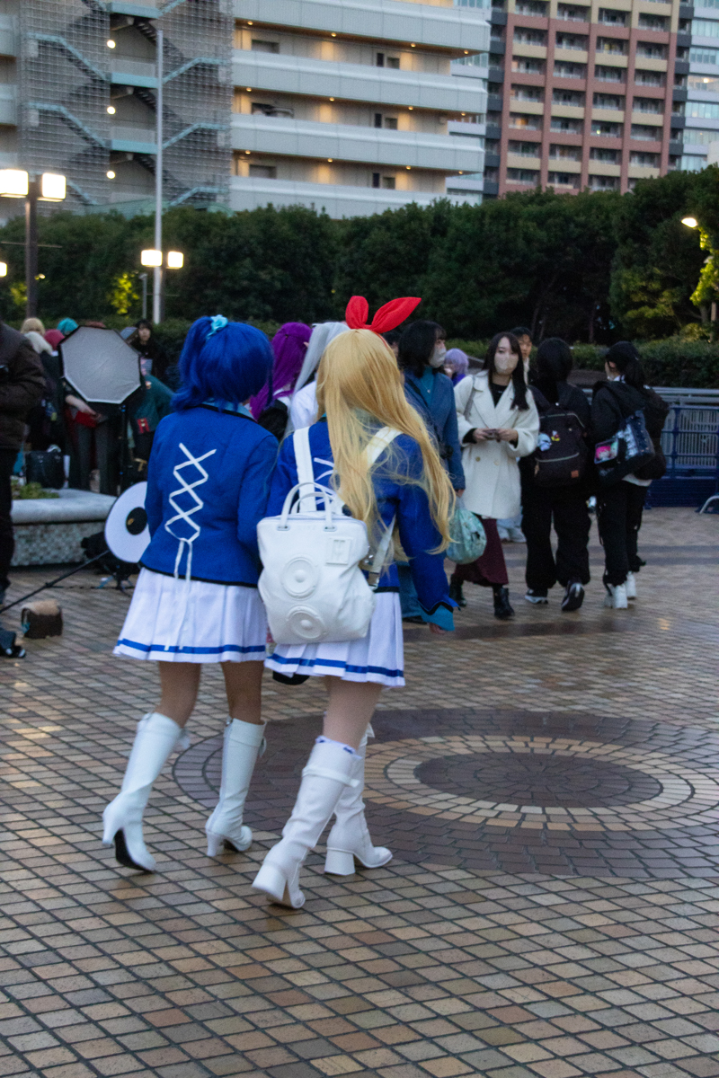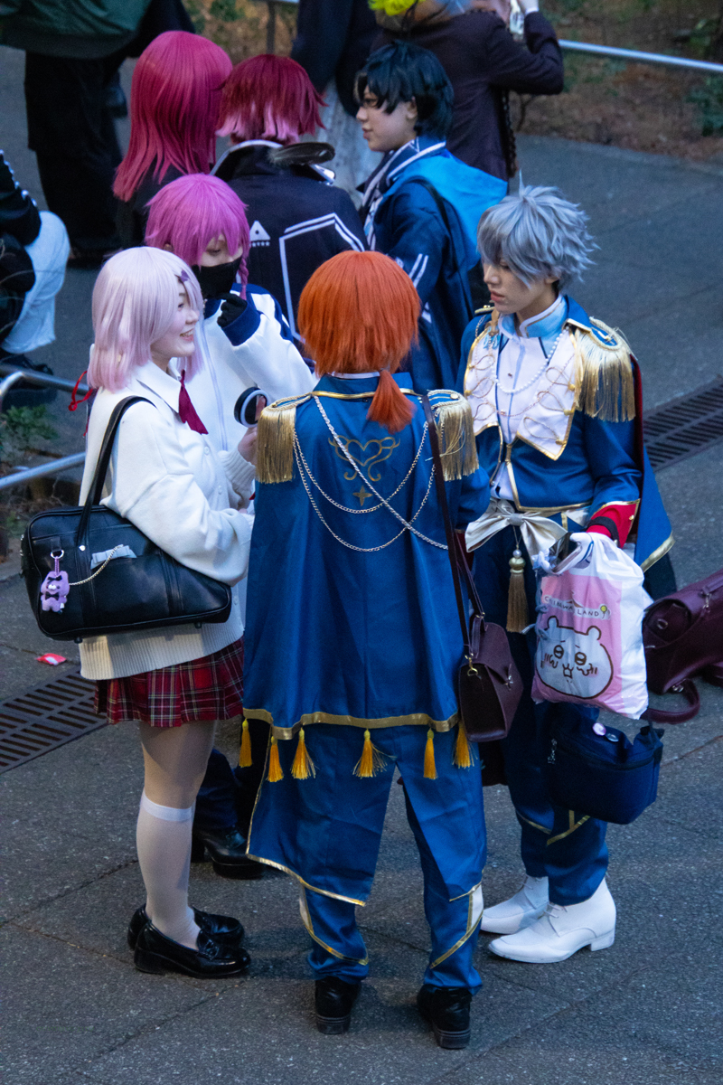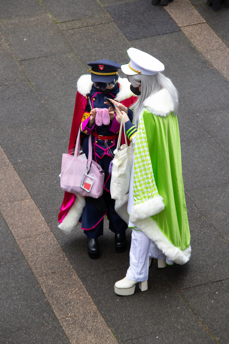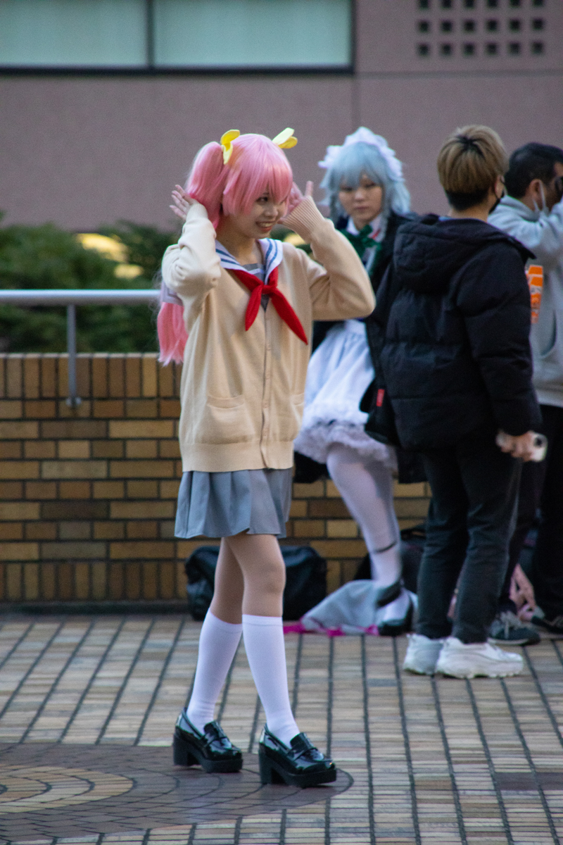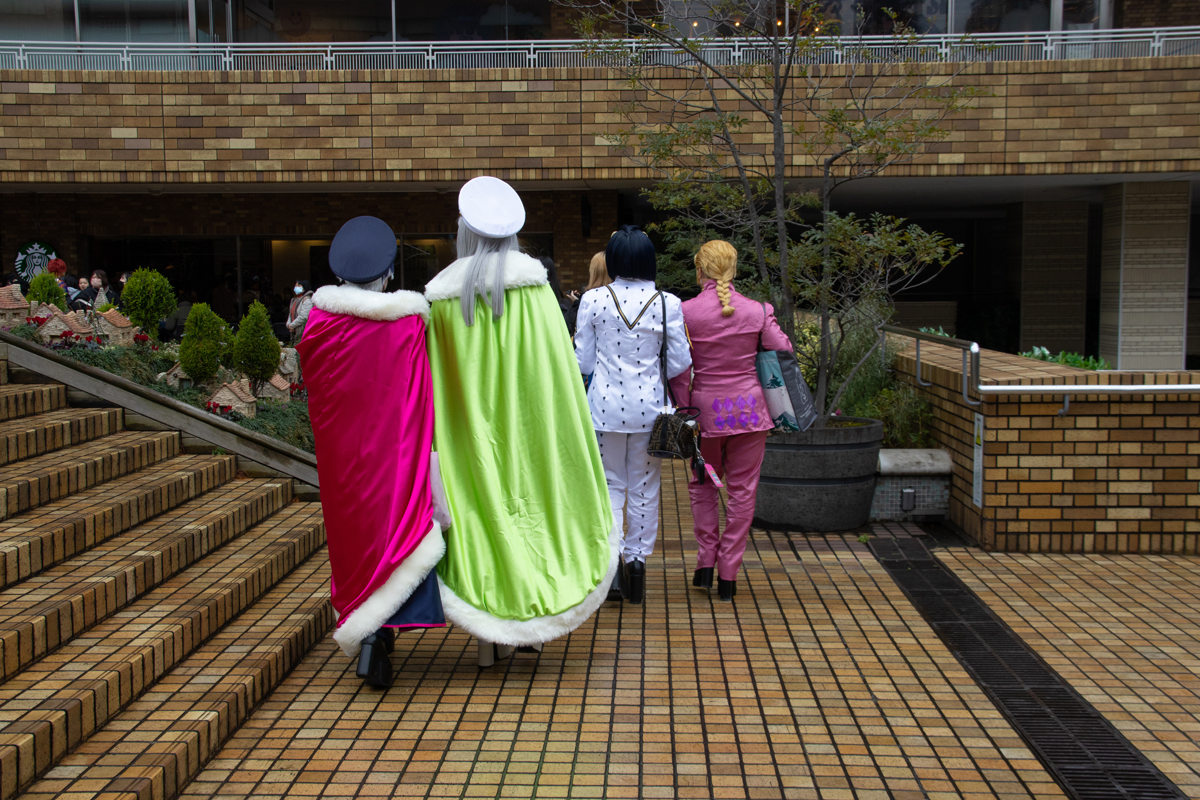 Later ontdekten we dat er buiten, direct naast ons hotel, nog veel meer rondliepen. Maar het bleek wel een bijzondere gelegenheid te zijn: er was een soort cosplay ontmoetingsweekend , met heel veel meisjes – en enkele jongens – verkleed als manga personages. De een nog kleurrijker dan de ander, maar allemaal tot in de puntjes afgewerkt. Oog voor detail hebben ze wel in Japan. Ik heb natuurlijk zoveel mogelijk foto’s proberen te maken, al was dat buiten wat moeilijker: er liep een heel verzameling beroepsfotografen rond om fotosessies te doen met de meisjes en toeristen met grote camera’s waren niet echt welkom. Maar toch wel kiekjes kunnen maken, net buiten het festivalterrein. De modellen zelf hadden meestal geen bezwaar, degenen die me zagen vonden het zelfs leuk. En wij ook!