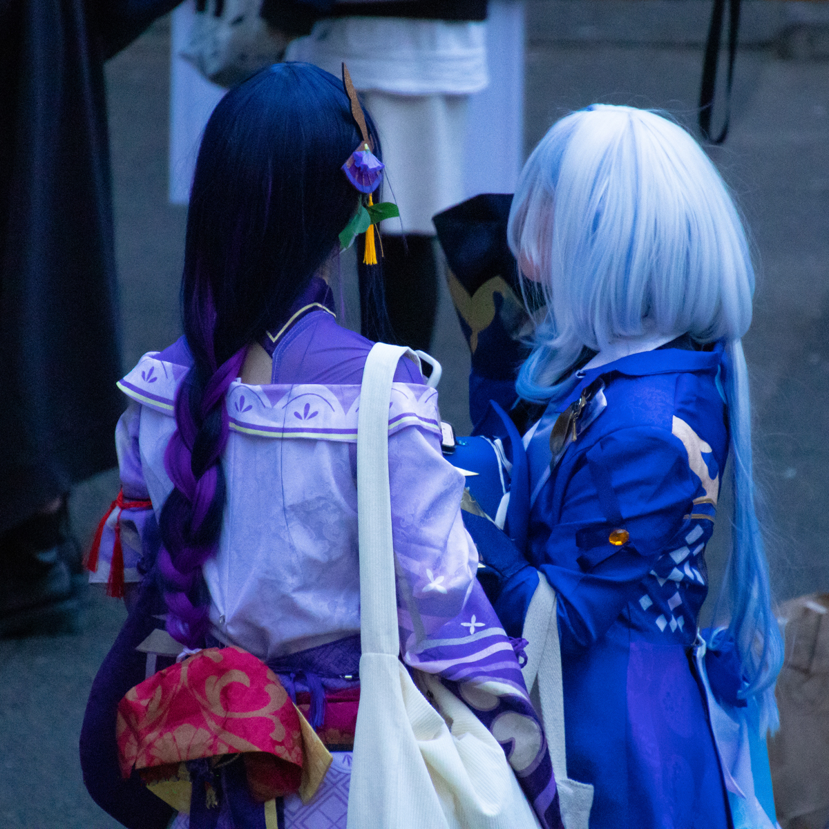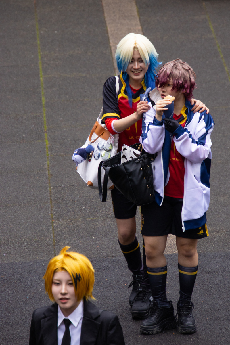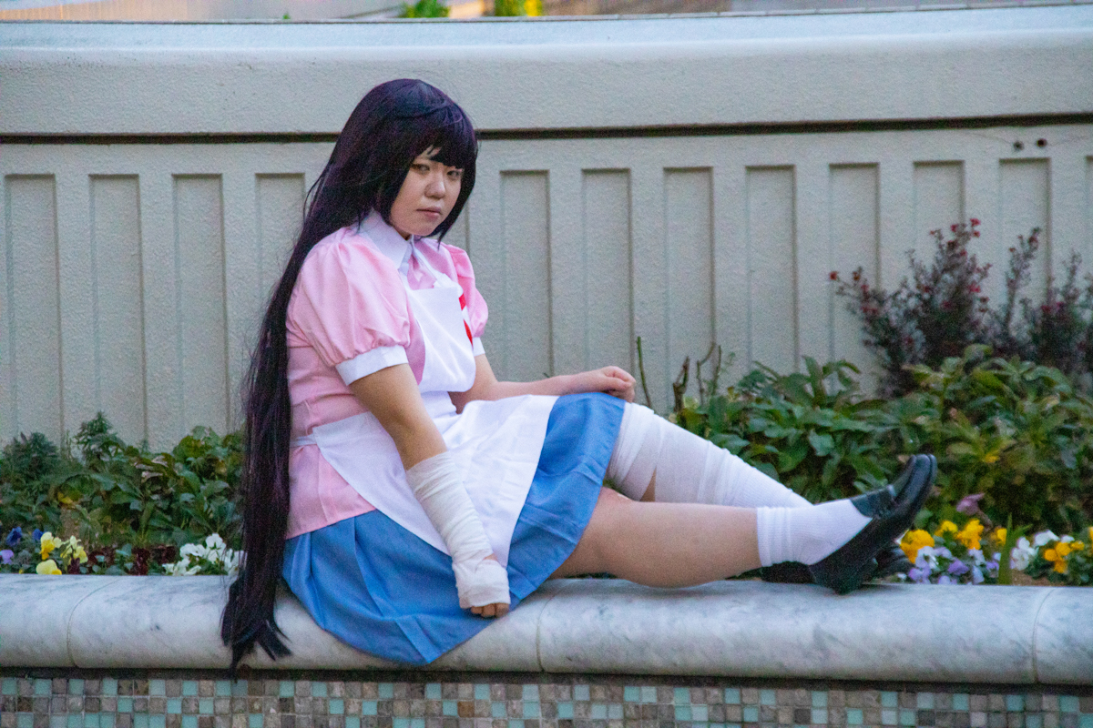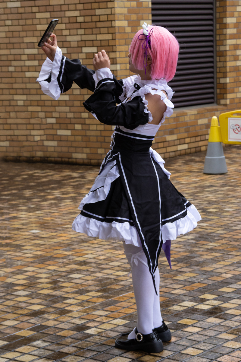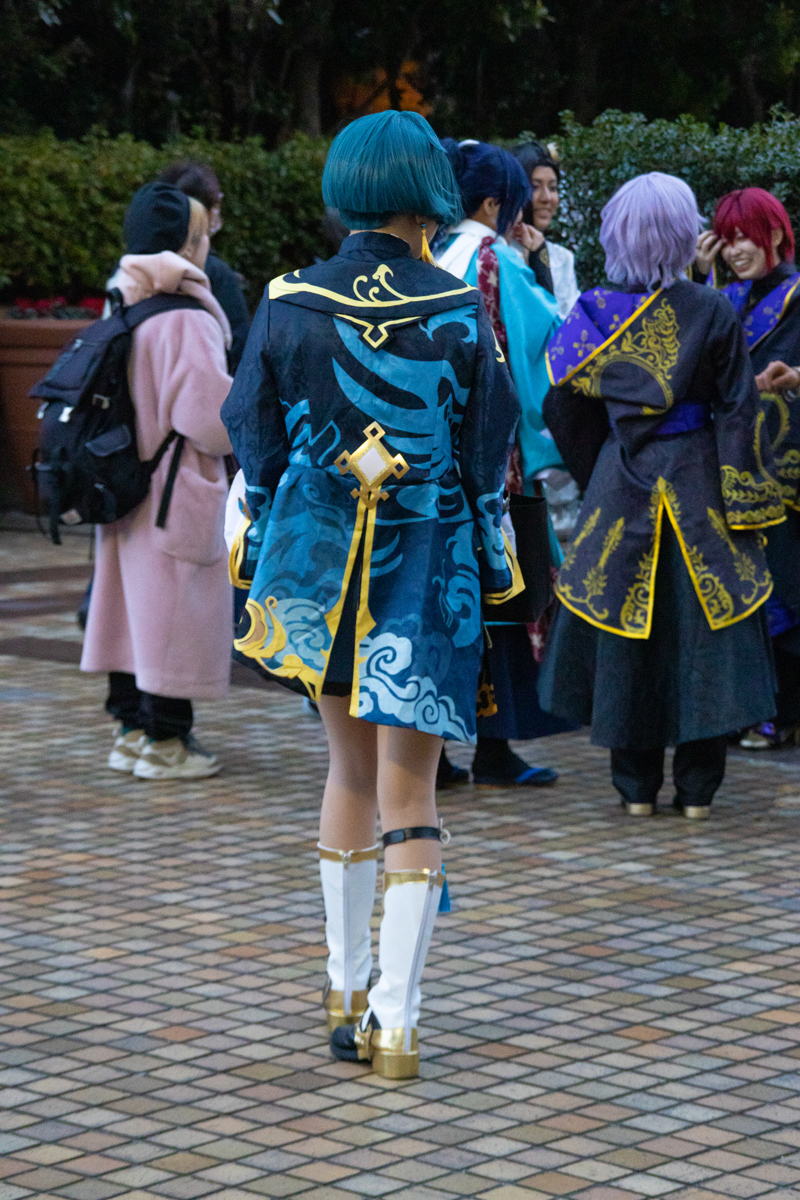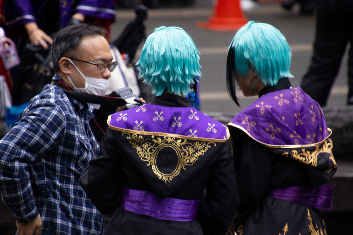 Later ontdekten we dat er buiten, direct naast ons hotel, nog veel meer rondliepen. Maar het bleek wel een bijzondere gelegenheid te zijn: er was een soort cosplay ontmoetingsweekend , met heel veel meisjes – en enkele jongens – verkleed als manga personages. De een nog kleurrijker dan de ander, maar allemaal tot in de puntjes afgewerkt. Oog voor detail hebben ze wel in Japan. Ik heb natuurlijk zoveel mogelijk foto’s proberen te maken, al was dat buiten wat moeilijker: er liep een heel verzameling beroepsfotografen rond om fotosessies te doen met de meisjes en toeristen met grote camera’s waren niet echt welkom. Maar toch wel kiekjes kunnen maken, net buiten het festivalterrein. De modellen zelf hadden meestal geen bezwaar, degenen die me zagen vonden het zelfs leuk. En wij ook!