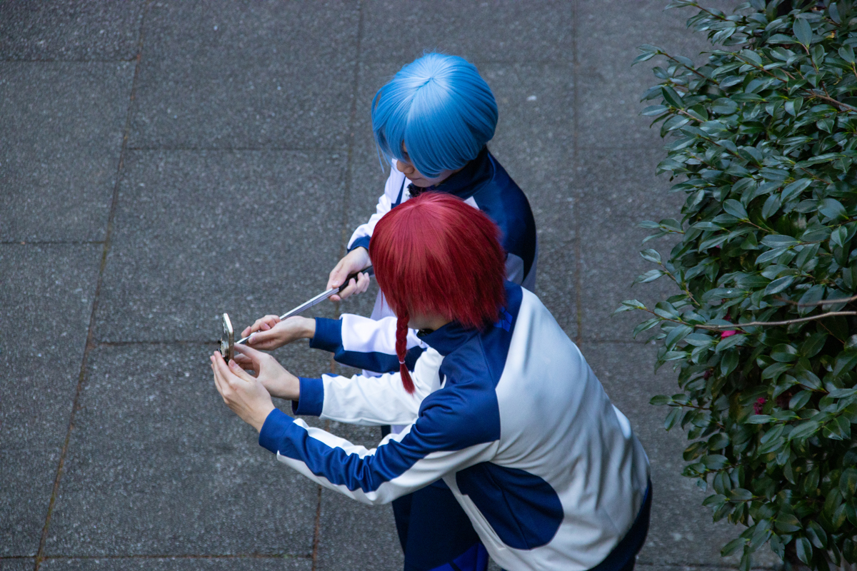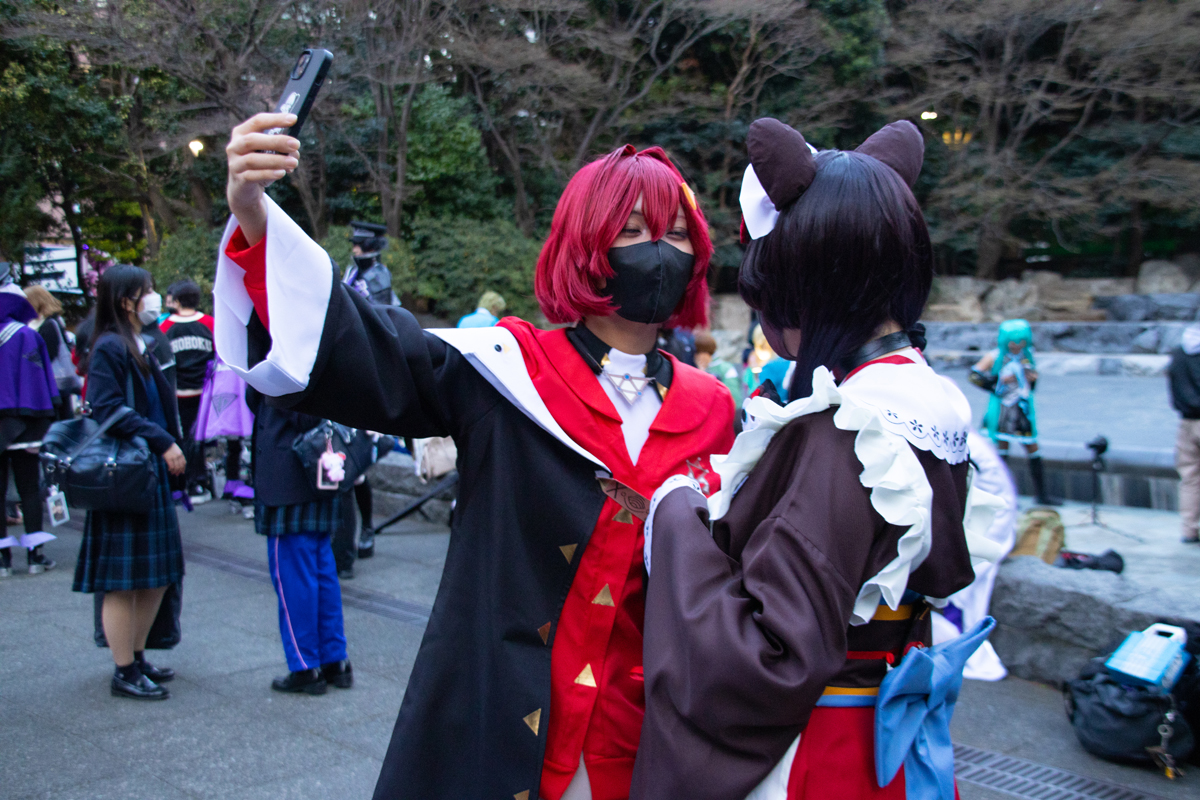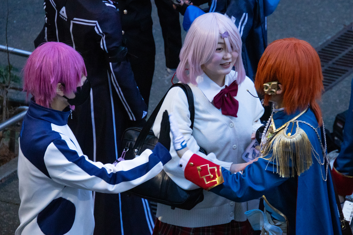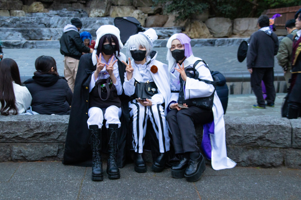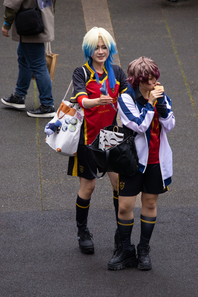 Later ontdekten we dat er buiten, direct naast ons hotel, nog veel meer rondliepen. Maar het bleek wel een bijzondere gelegenheid te zijn: er was een soort cosplay ontmoetingsweekend , met heel veel meisjes – en enkele jongens – verkleed als manga personages. De een nog kleurrijker dan de ander, maar allemaal tot in de puntjes afgewerkt. Oog voor detail hebben ze wel in Japan. Ik heb natuurlijk zoveel mogelijk foto’s proberen te maken, al was dat buiten wat moeilijker: er liep een heel verzameling beroepsfotografen rond om fotosessies te doen met de meisjes en toeristen met grote camera’s waren niet echt welkom. Maar toch wel kiekjes kunnen maken, net buiten het festivalterrein. De modellen zelf hadden meestal geen bezwaar, degenen die me zagen vonden het zelfs leuk. En wij ook!