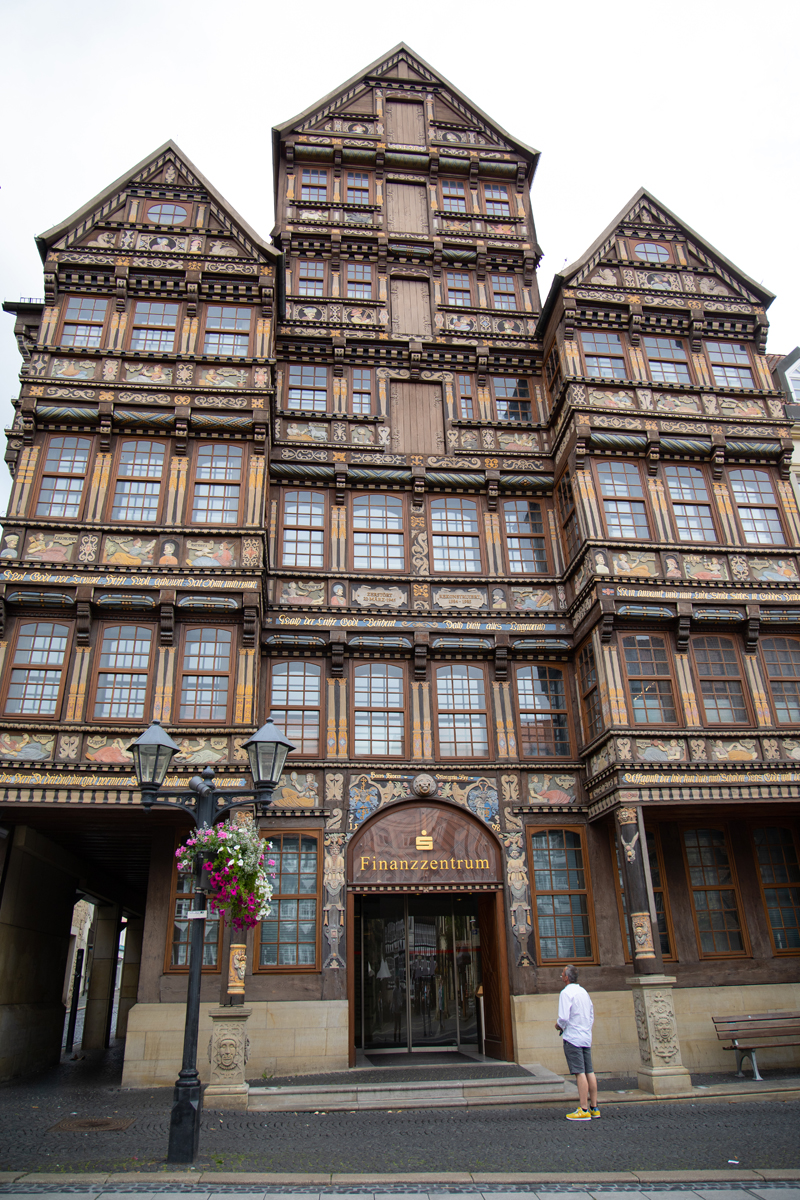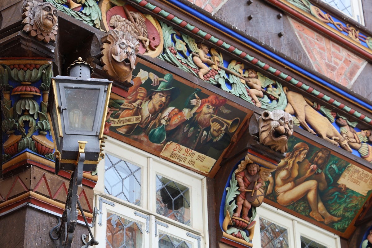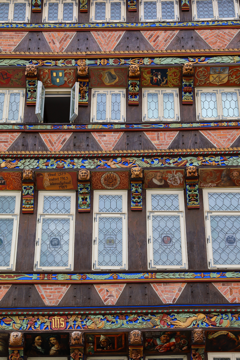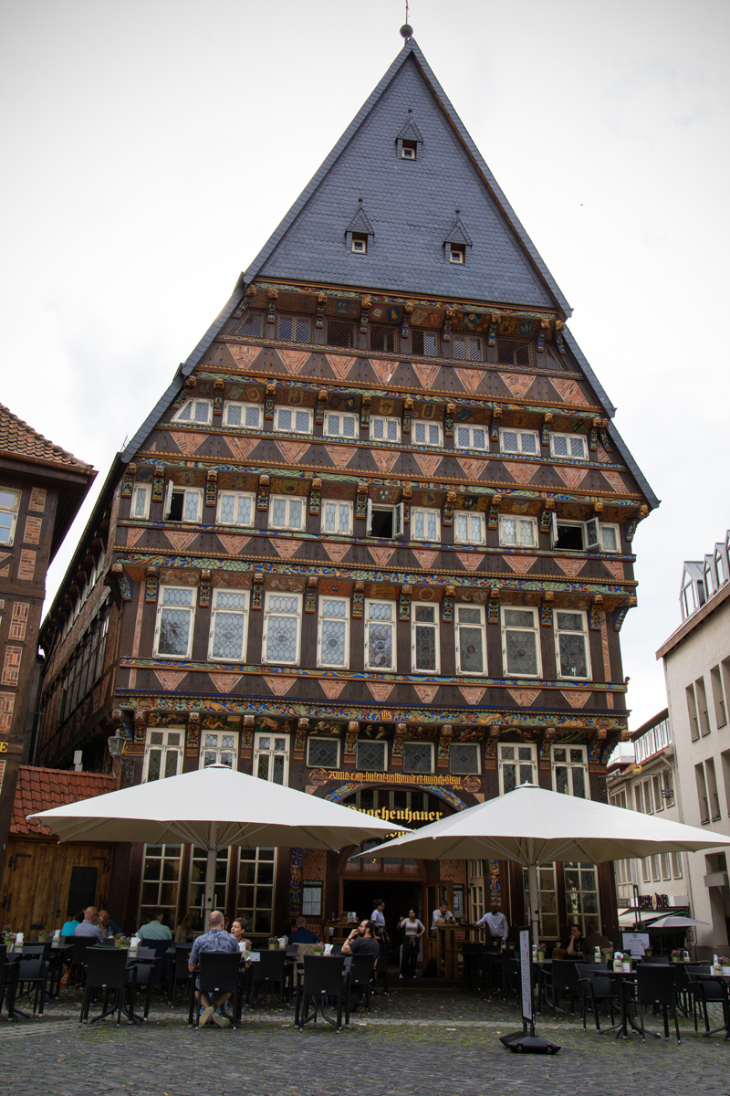 Na een korte opfrisbeurt in het hotel liepen we het mooie centrum in, waar we in eerste instantie rechtstreeks naar het marktplein liepen. Daar was al direct veel moois te zien, waaronder het ‘Knochenhaueramtshaus’, het voormalige gildehuis voor de vleeshouwers. Het gebouw is in 1529 gebouwd en in de periode 1986-1989 gereconstrueerd, nadat het in de tweede wereldoorlog flink beschadigd was – overigens na een paar eerdere verbouwingen, onder meer na een flinke brand in 1884. Het pand is dus niet helemaal authentiek, maar de schoonheid er van heeft er niet onder geleden. Tegenwoordig is er een restaurantje onderin het pand gevestigd, KA7, waar wij een lekkere schnitzel hebben gegeten (je bent in Duitsland of niet hè…).