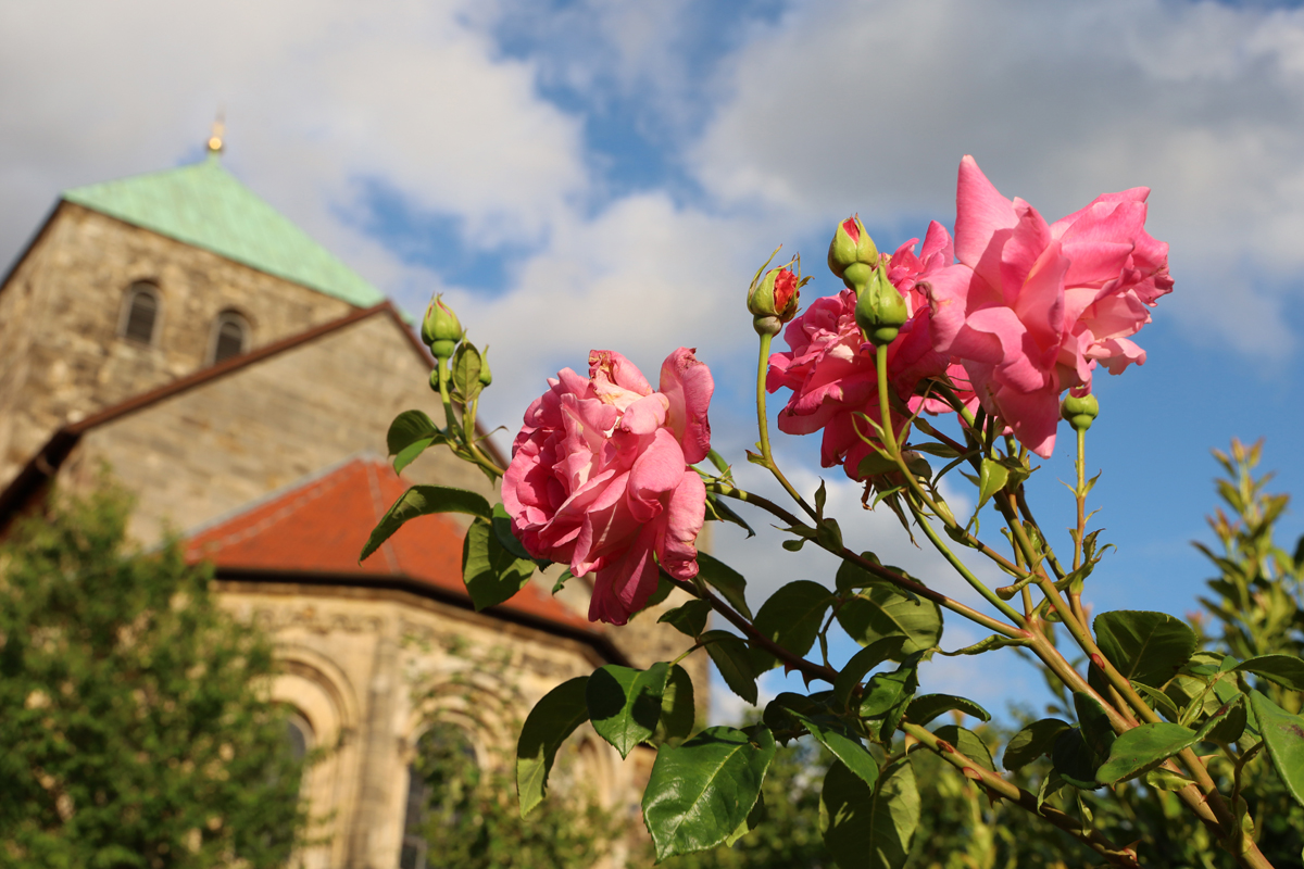 Met de buik vol hadden we nog zin en tijd voor een korte stadswandeling, waar we een indruk kregen van de prachtige panden en ontdekten dat er een zogenaamde Rozenroute door de stad loopt. De roos is het symbool van Hildesheim en door de route te volgen, kom je alle hoogtepunten tegen. Eén van die hoogtepunten is een duizenden jaren oude rozenstruik bij de apsis van de kathedraal, die alle rampen door de tijd heen wist te overleven en daarom gekozen is als symbool. Omdat we ons niet van tevoren hadden ingelezen, hebben we de roos helaas gemist – al is de roos op de foto misschien verwant aan de oude struik?