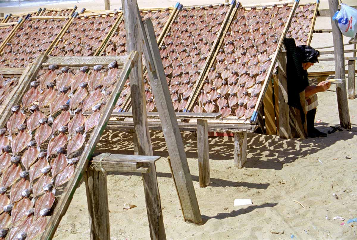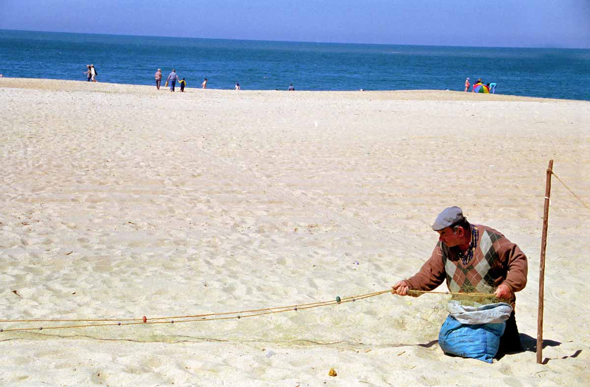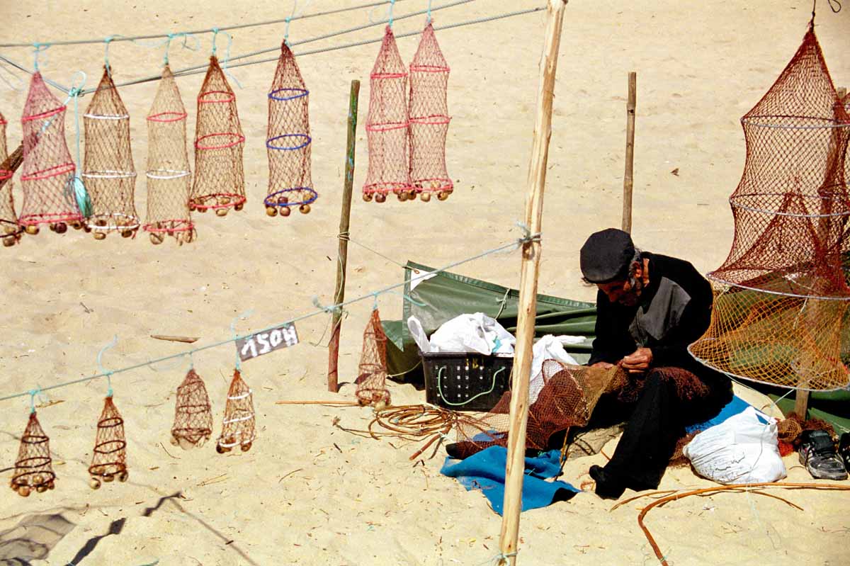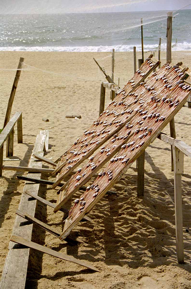 Nazaré is drukbezocht door toeristen, maar ook nog gewoon een traditioneel vissersdorp. Al slenterend over de mooie boulevard kom je de visjes tegen, die op rekken langs het strand gedroogd worden. Mannen en vrouwen zijn druk in de weer met het sorteren en schoonmaken van de vis, het boeten van de netten het verkopen van vis en souvenirs. Eerder schreef ik al een stukje over de traditionele kleding met zeven rokken, die veel vrouwen nog dragen. Bijzonder om te zien. Natuurlijk zijn er vele plekken waar je de vangst op je bord kunt krijgen, voor een smakelijke lunch of diner: Nazaré (en sowieso Portugal) is een walhalla voor visliefhebbers. Bom apetite!