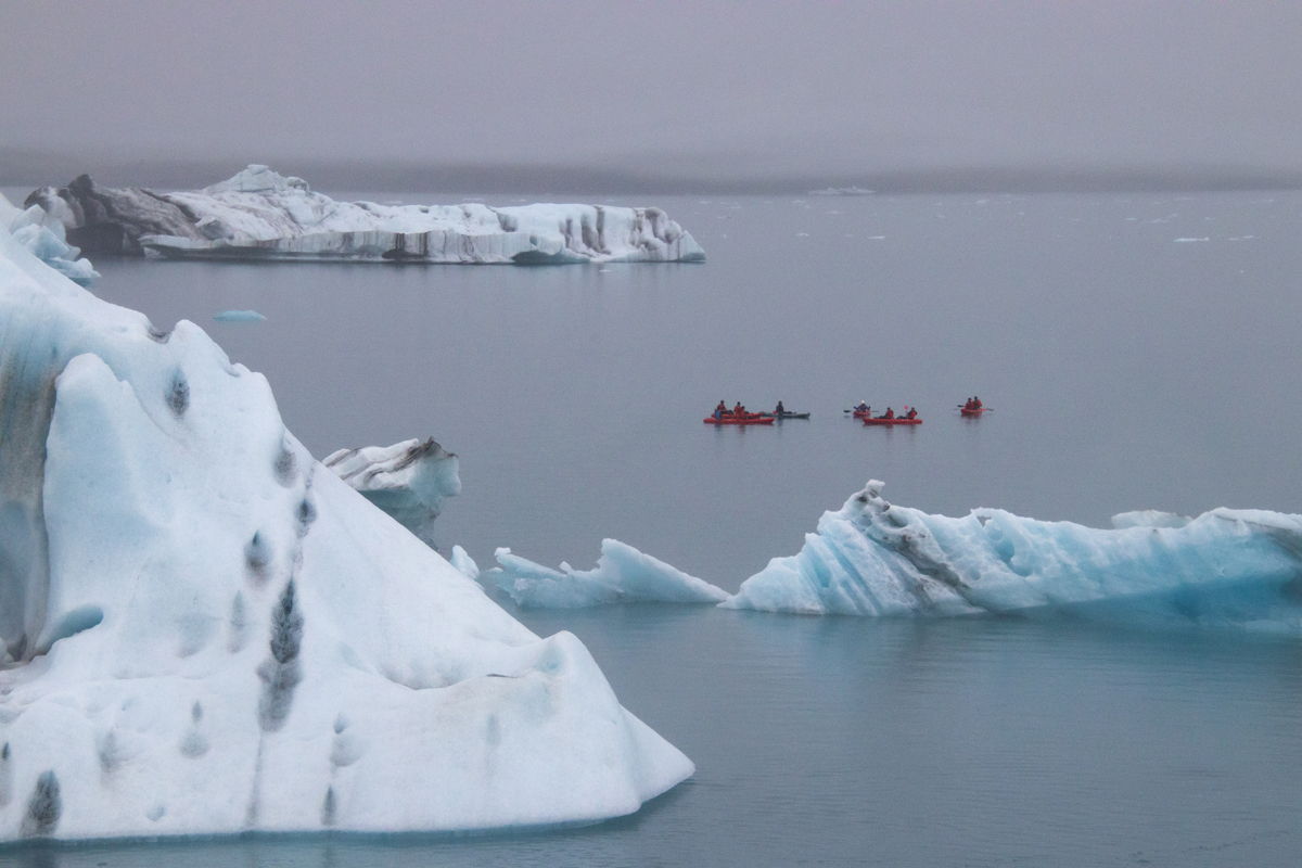 Het tochtje zelf vonden we op zich leuk, je vaart tussen de ijsbergen door en dat is best bijzonder. Maar al met al vond ik het niet heel veel toevoegen aan de ervaring, vanaf de kant heb je een veel mooier overzicht. Omdat het behoorlijk regenachtig was in 2022, zijn Carlo en ik daarom maar gewoon aan land gebleven. Wel leuk om andere bootjes te zien varen – het oranje van de zwemvesten en kano’s duidelijk zichtbaar tegen de achtergrond van al dat wit en blauw. Als je zelf wel graag in een bootje wil, is het advies om vooraf te reserveren via internet, omdat er anders misschien geen plek is.