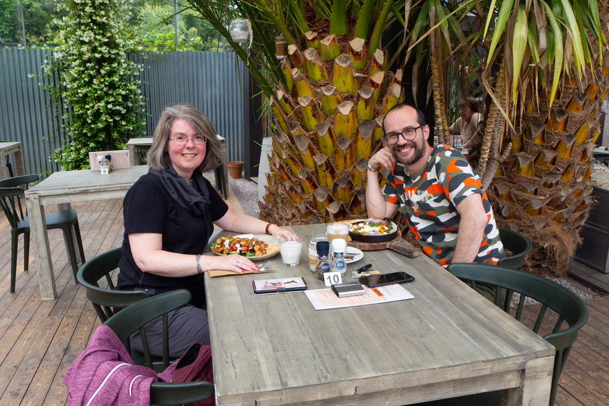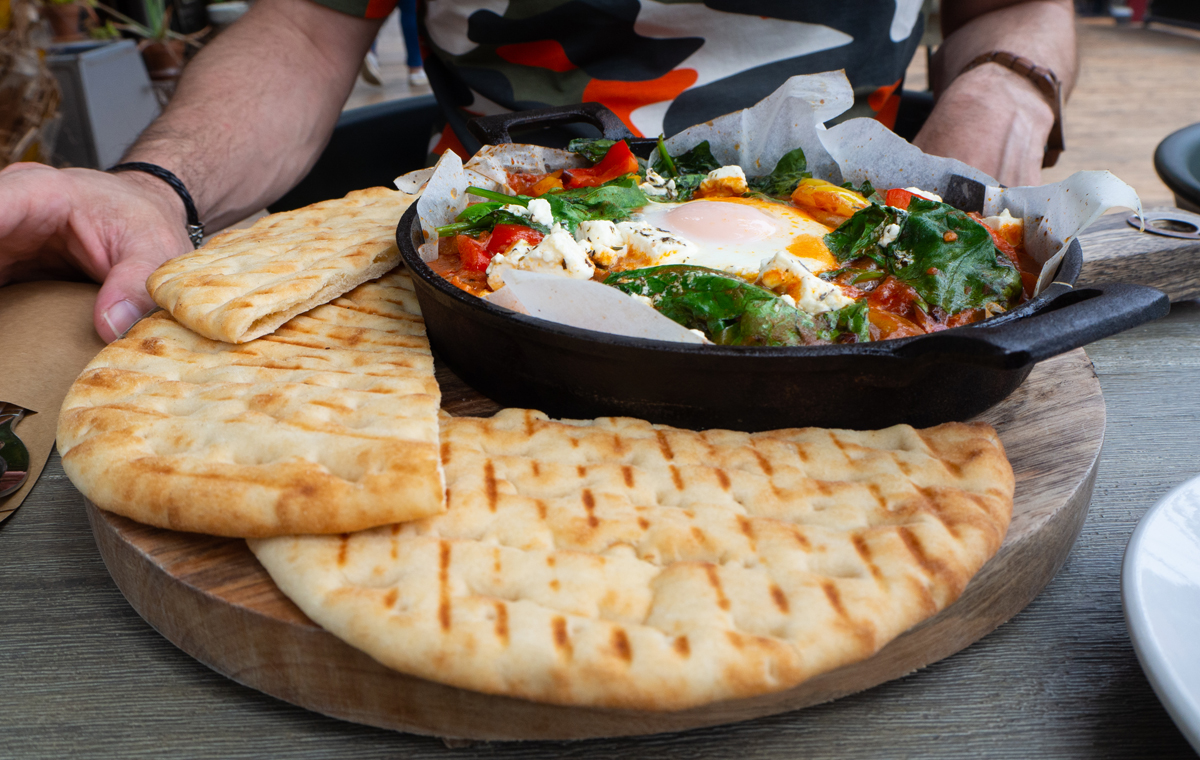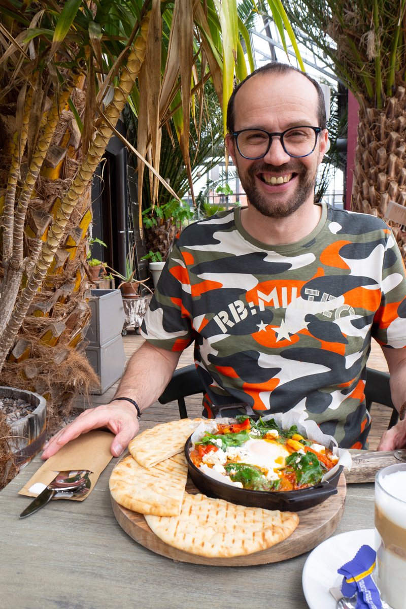 Onderweg naar onze overnachtingsplek in Friesland in 2022, maakten we een stop in Joure voor de lunch. Van tevoren had Carlo even gegoogled naar een inspirerende plek en dat was gelukt. We namen bij ‘De Oranjerie‘ plaats in de tropische serre, waar echte palmbomen voor de juiste sfeer zorgen. Het eten was ook nog eens heel lekker. Of het nog op de kaart staat weet ik niet, maar Carlo had een heerlijke shaksuka: een oorspronkelijk Tunesisch gerecht van gepocheerde eieren in een tomatensaus (bron: Wikipedia). Ik had een lekkere pitabroodje met knoflooksaus, olijven en kip. Een tropische start van ons Friese weekend.
