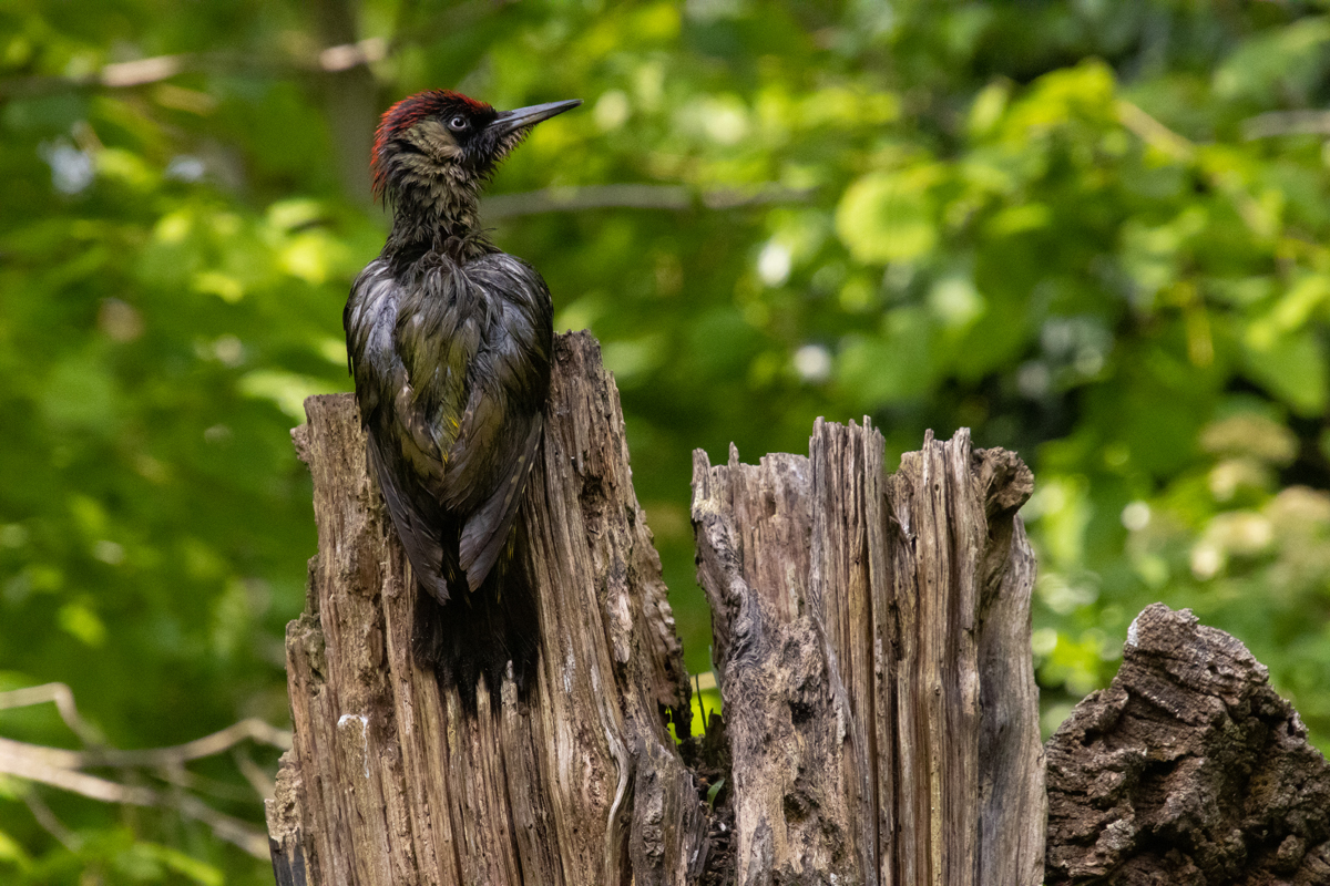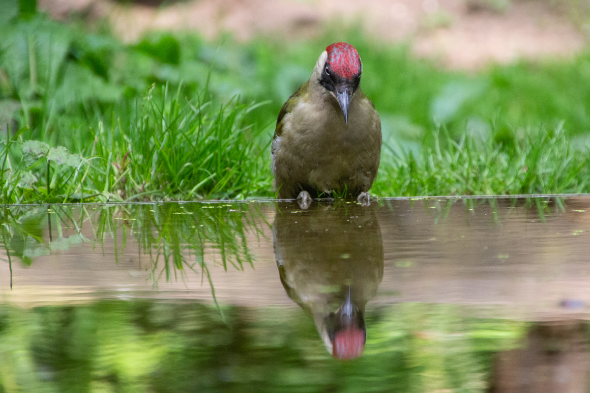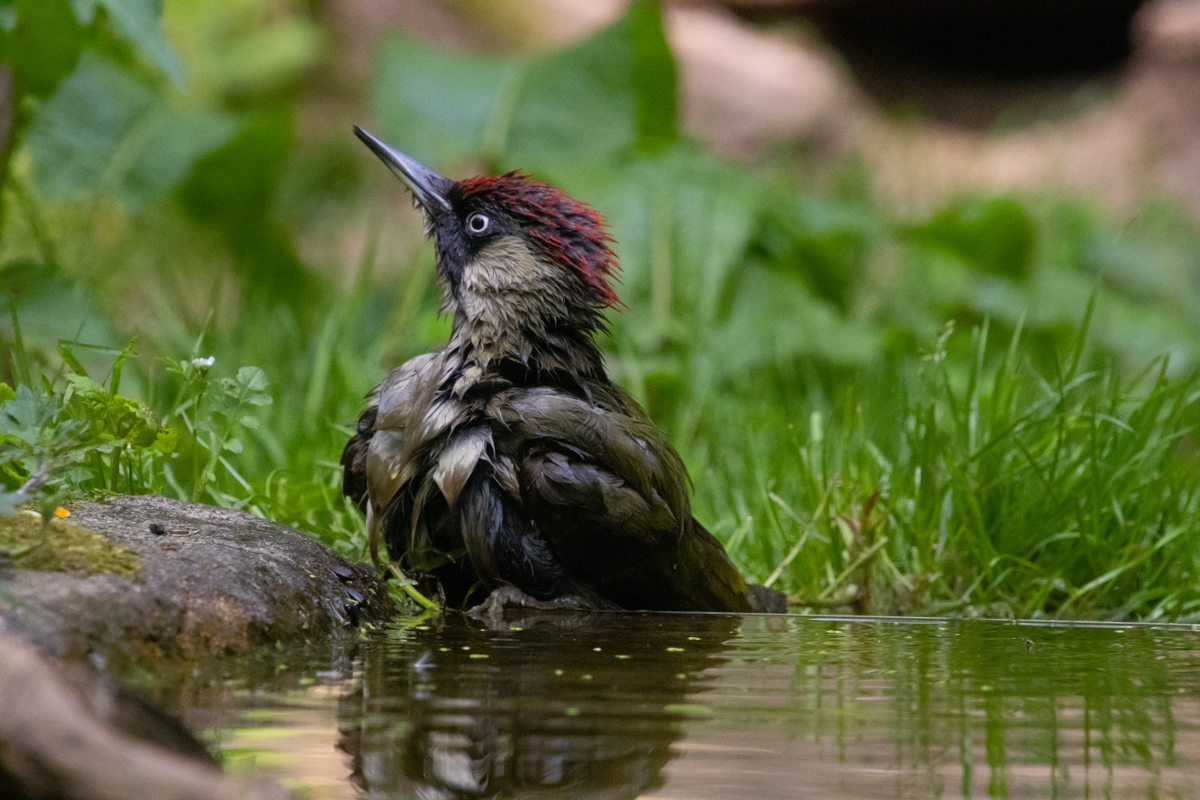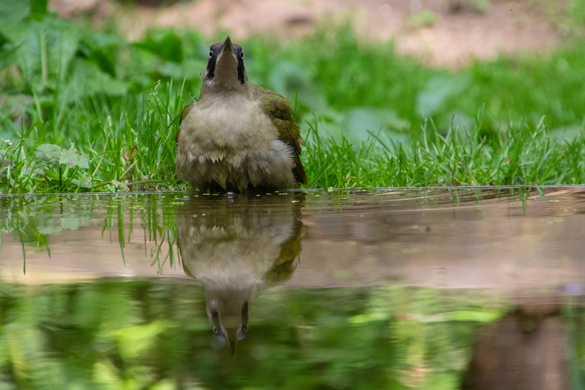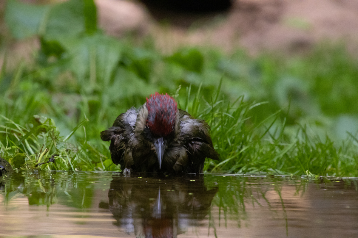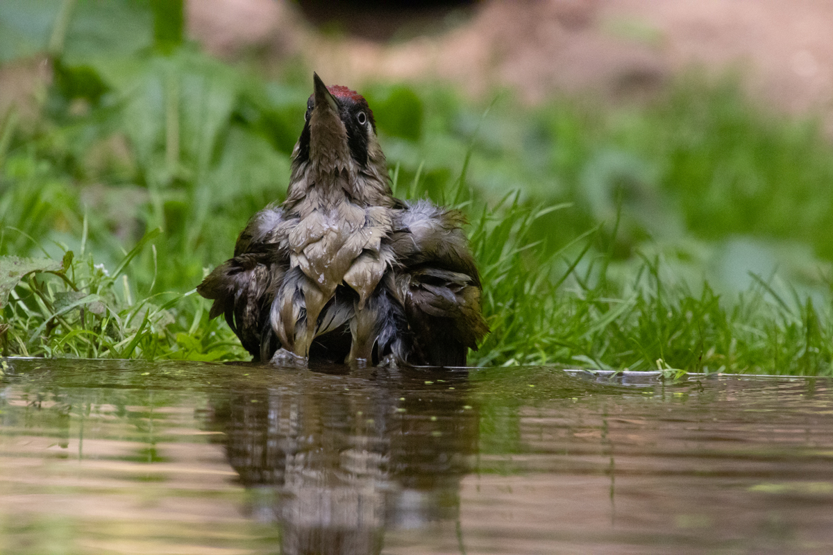 We hadden een lange dag doorgebracht in de fotohut in Drenthe en hadden al vele vogels langs zien komen. Tegen het einde van de middag snakten we naar frisse lucht en zon en besloten we te vertrekken. Nét nadat ik mijn camera had opgeborgen, landde er ineens een bijzondere gast: een groene specht! Die hadden we helemaal nog niet gezien! Snel trok ik mijn camera weer uit de tas en schoot snel een foto, maar onze gast besloot nog even een showtje weg te geven en een bad te nemen. Het werd een uitgebreide spettersessie, die eindigde met een doorweekte vogel, die er uit zag alsof je hem als een badspons zou kunnen uitknijpen. Op de valreep nog een serie bijzondere foto’s!