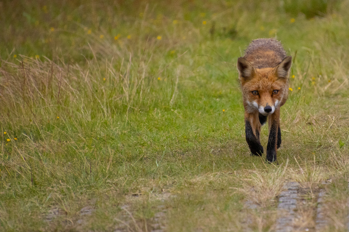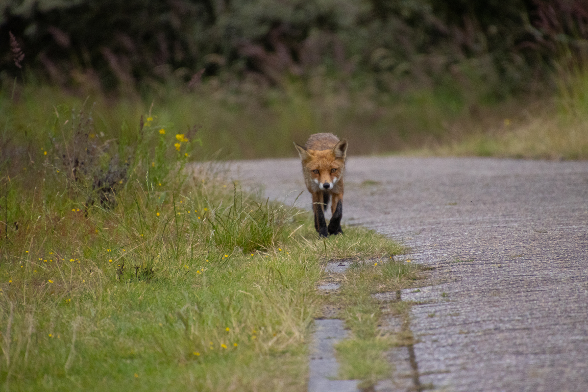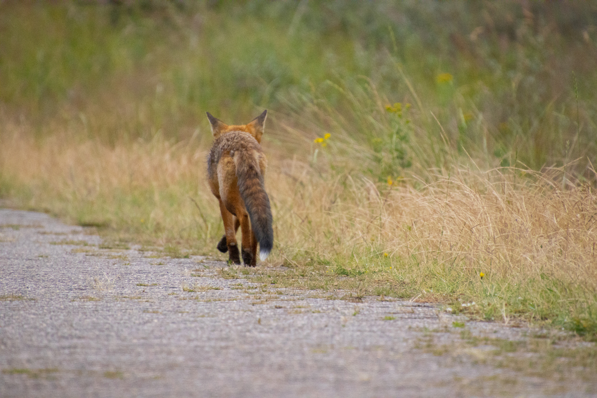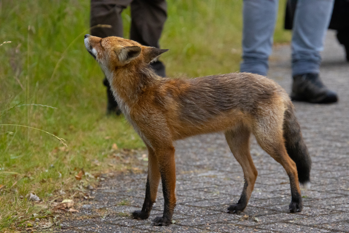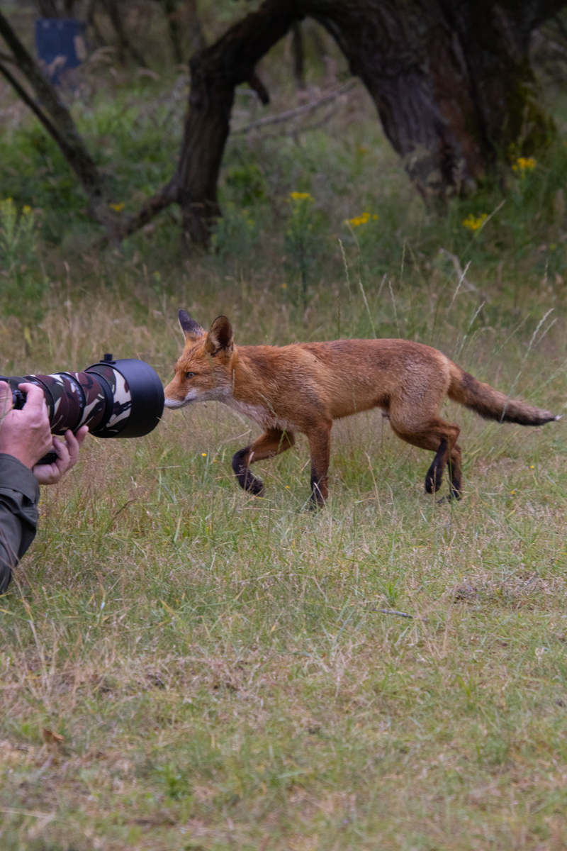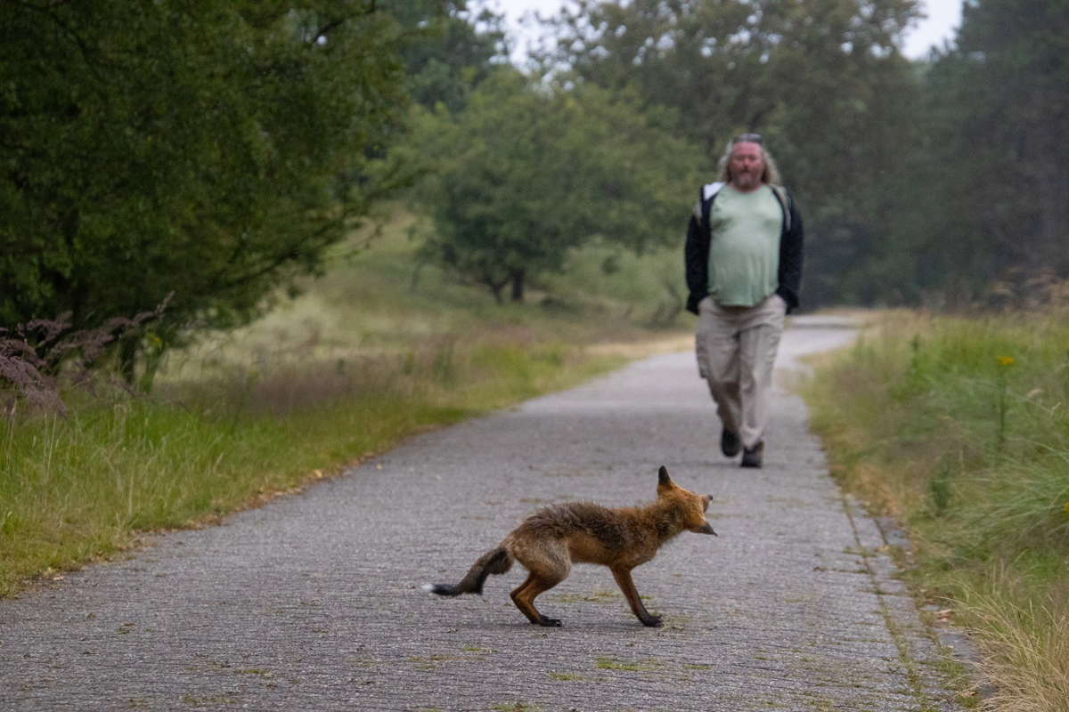 Al snel bleek dat de vosjes erg gewend zijn aan mensen. Sommige vosjes durfden de fotografen in onze groep tot op korte afstand te benaderen en ook van de wandelaar (rechtsonder op de foto) schrokken ze nauwelijks. Eentje passeerde mij zo rakelings, dat ik niet eens een foto kon maken – te dichtbij!