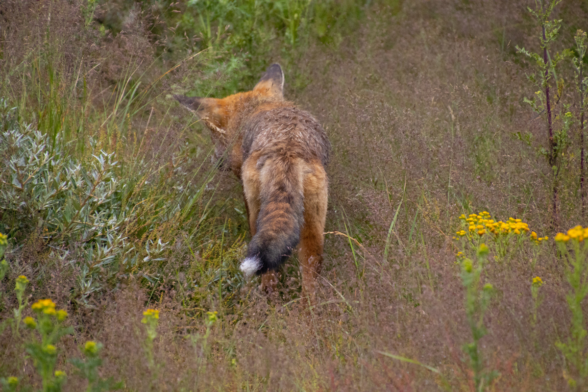 Ons werd verteld dat de menselijke bezoekers van het gebied de vos helaas te veel verstoren, waardoor men nu de stap heeft genomen bepaalde gebieden af te sluiten, zodat de burchten van de vossen niet meer benaderd kunnen worden. Zo heeft moeder vos rust en kunnen de jongen rustig opgroeien.