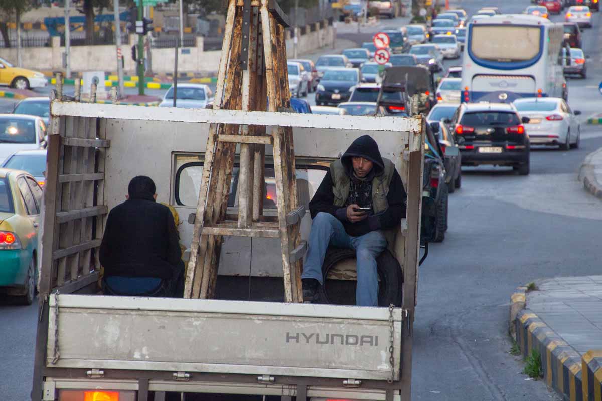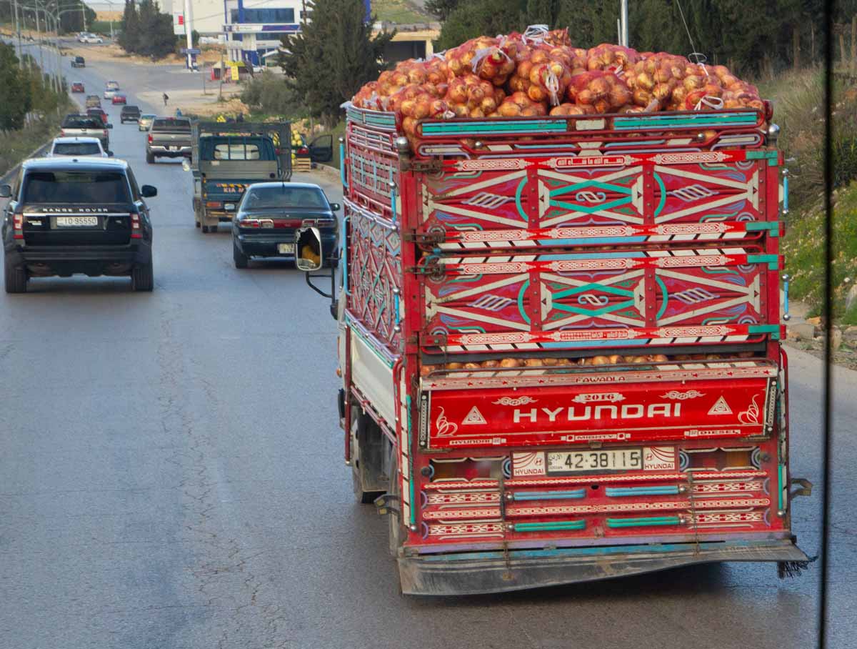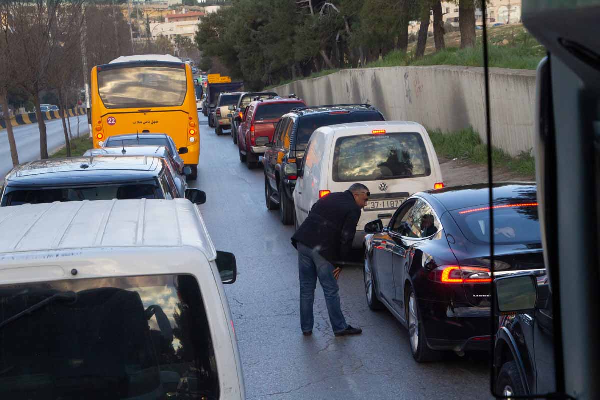 Tijdens onze rondreis door Jordanië in 2020, verbaasden wij ons af en toe over het verkeer. Eén en al hectiek van te hard rijdende en toeterende auto’s, wat voetgangers niet weerhoudt om gewoon verkeersrotondes over te steken of langs de autoweg vanalles te proberen te verkopen. In de file is het heel gewoon om even uit te stappen en een bekende te begroeten, die in een andere rij staat. En meerijden kan ook gewoon in de laadbak, zonder autogordels of iets dergelijks. Geen probleem.