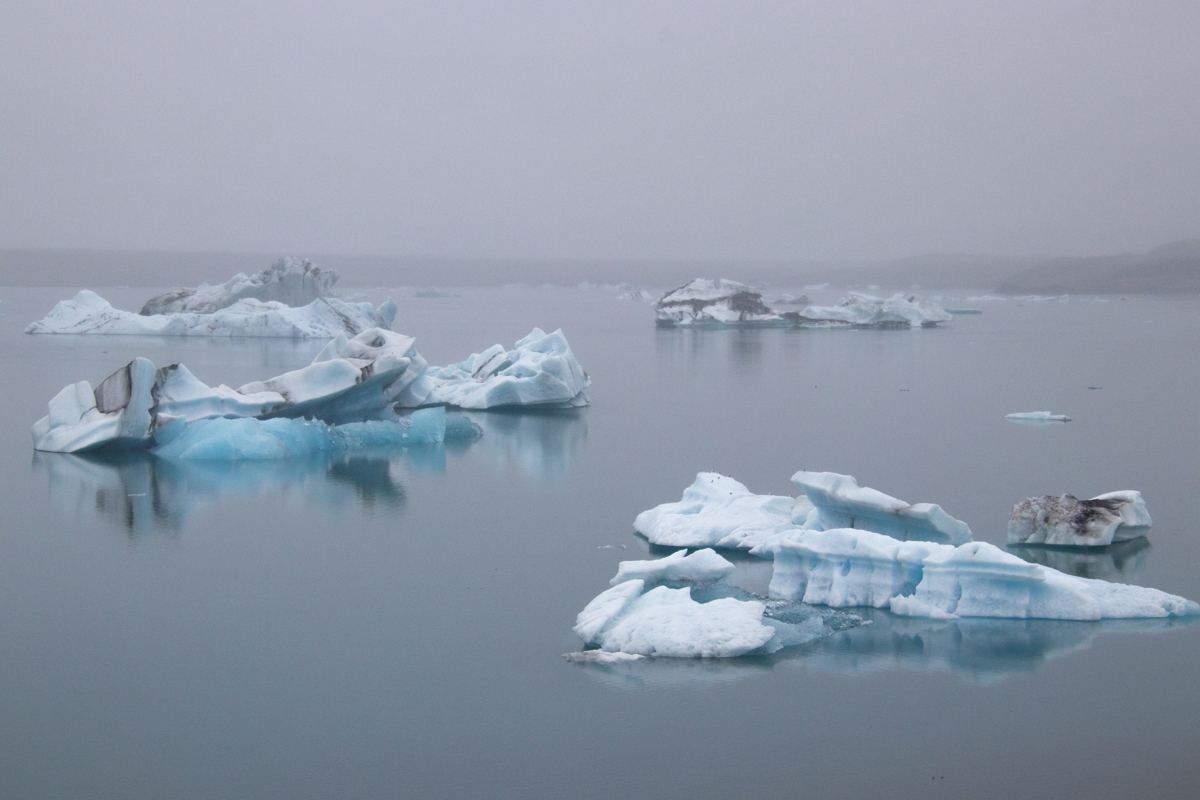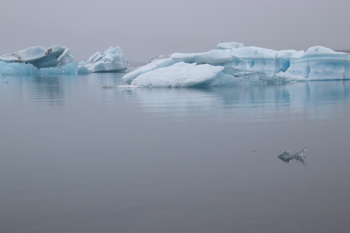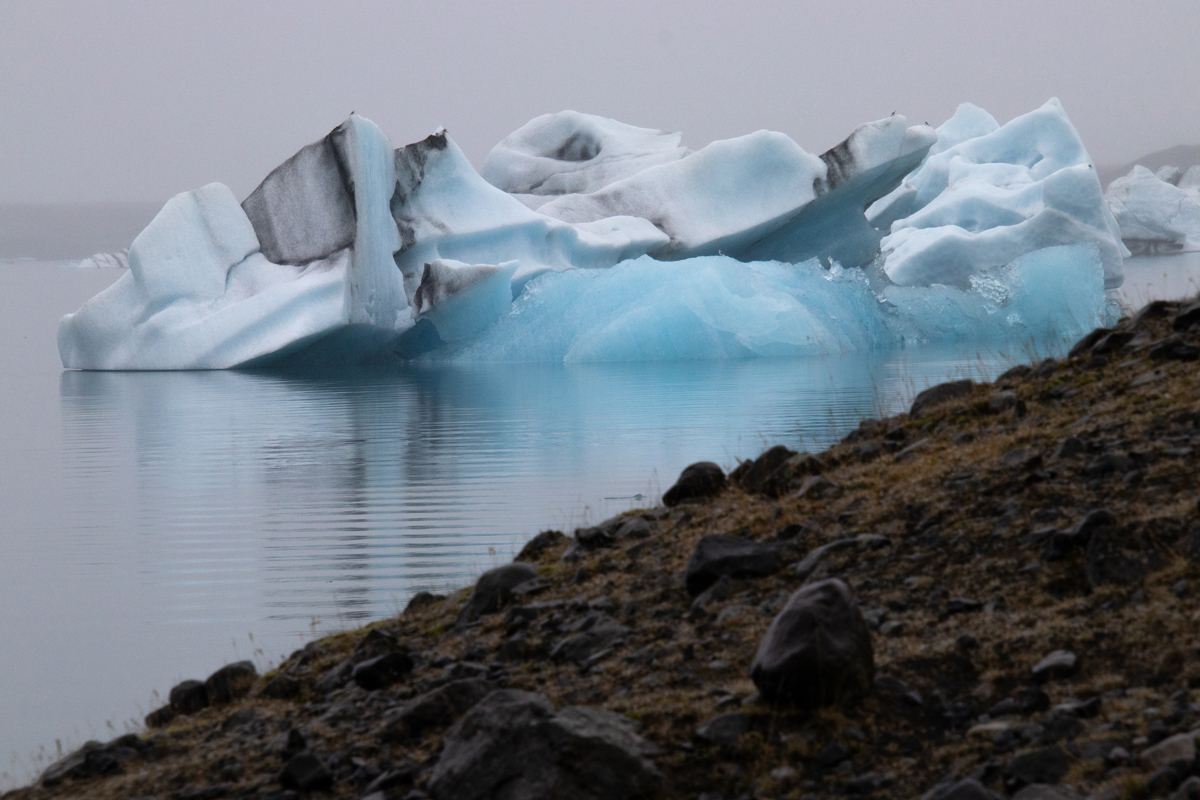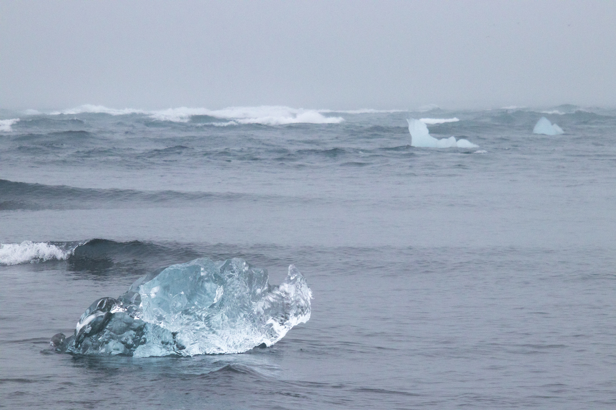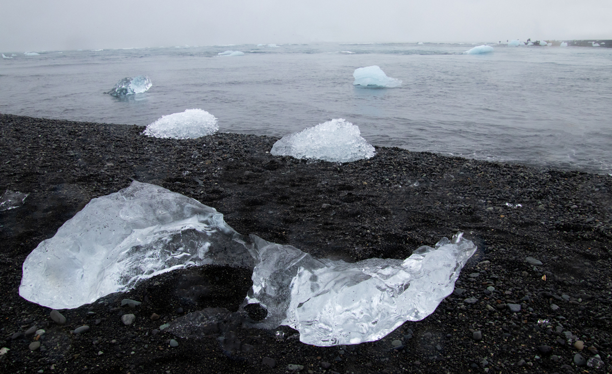 Vanaf het strand heb je zicht op de blauw-witte ijsschotsen die je van Jökulsárlón kent, die langzaam langs drijven.