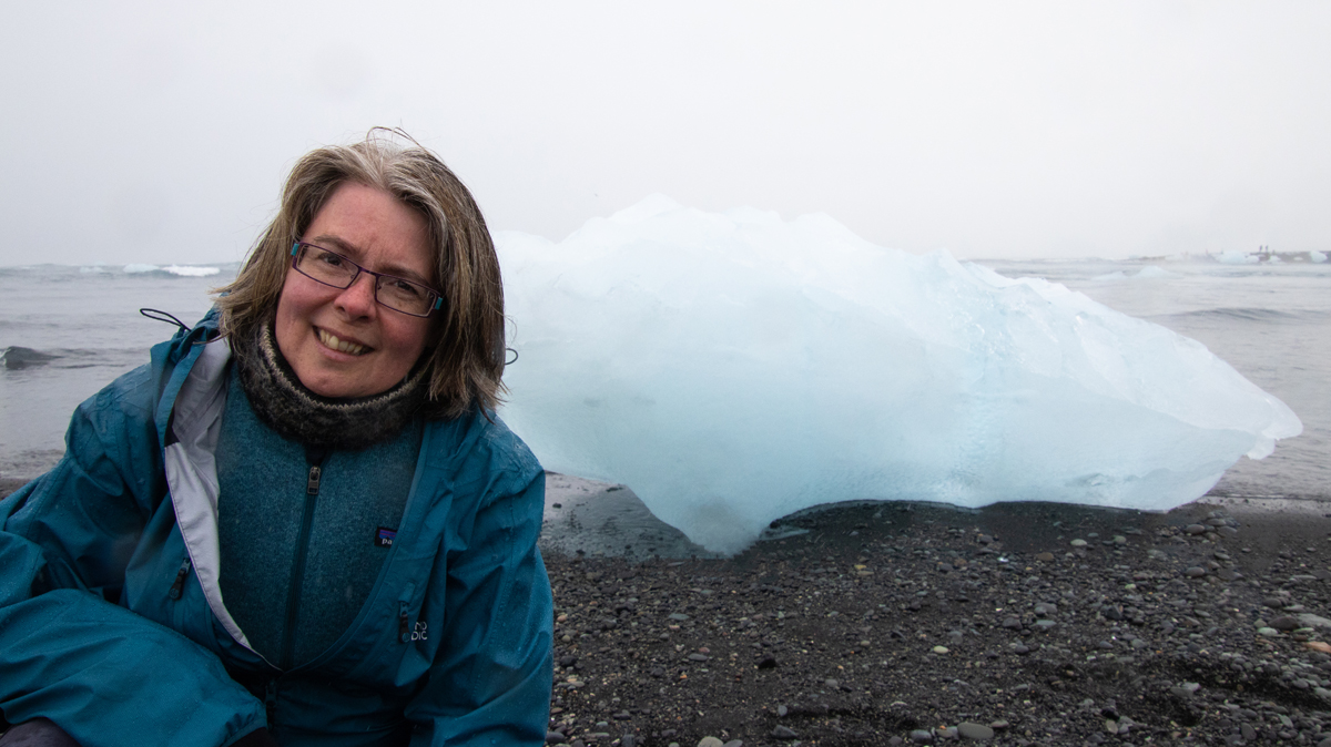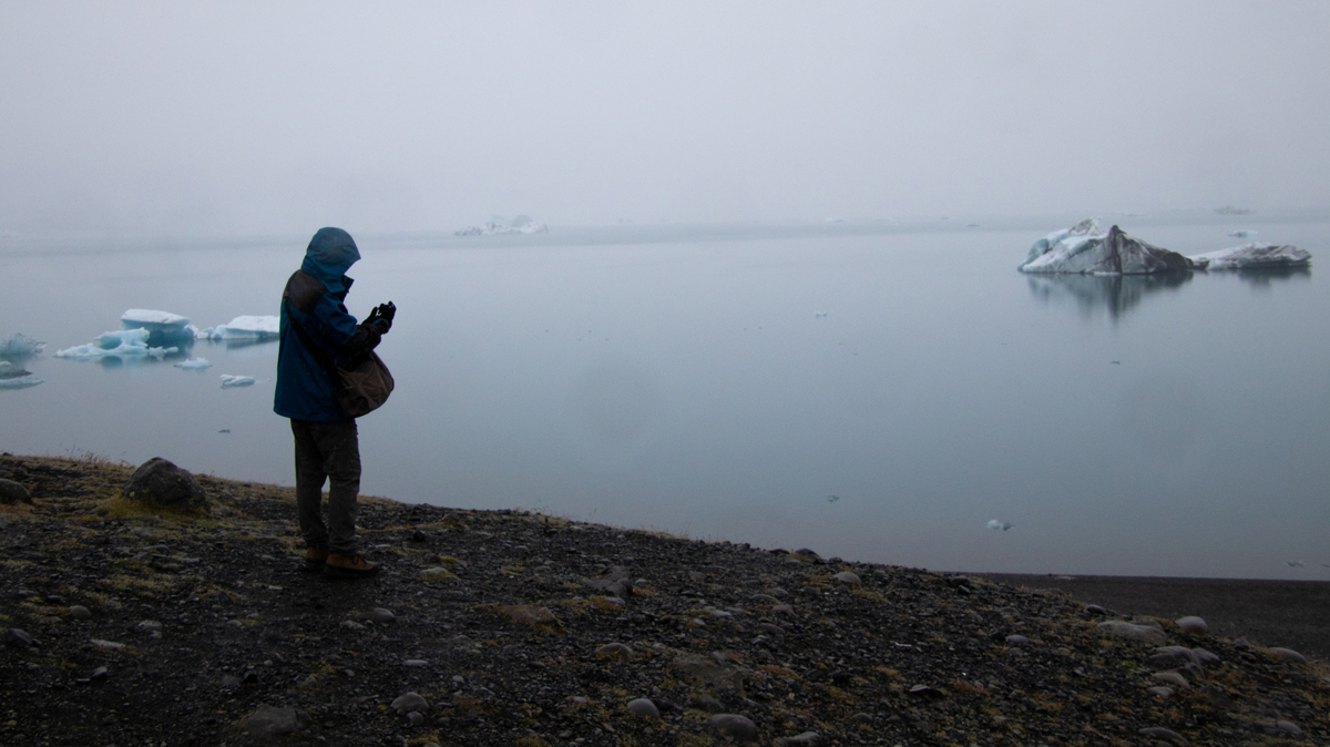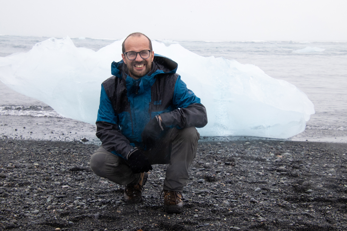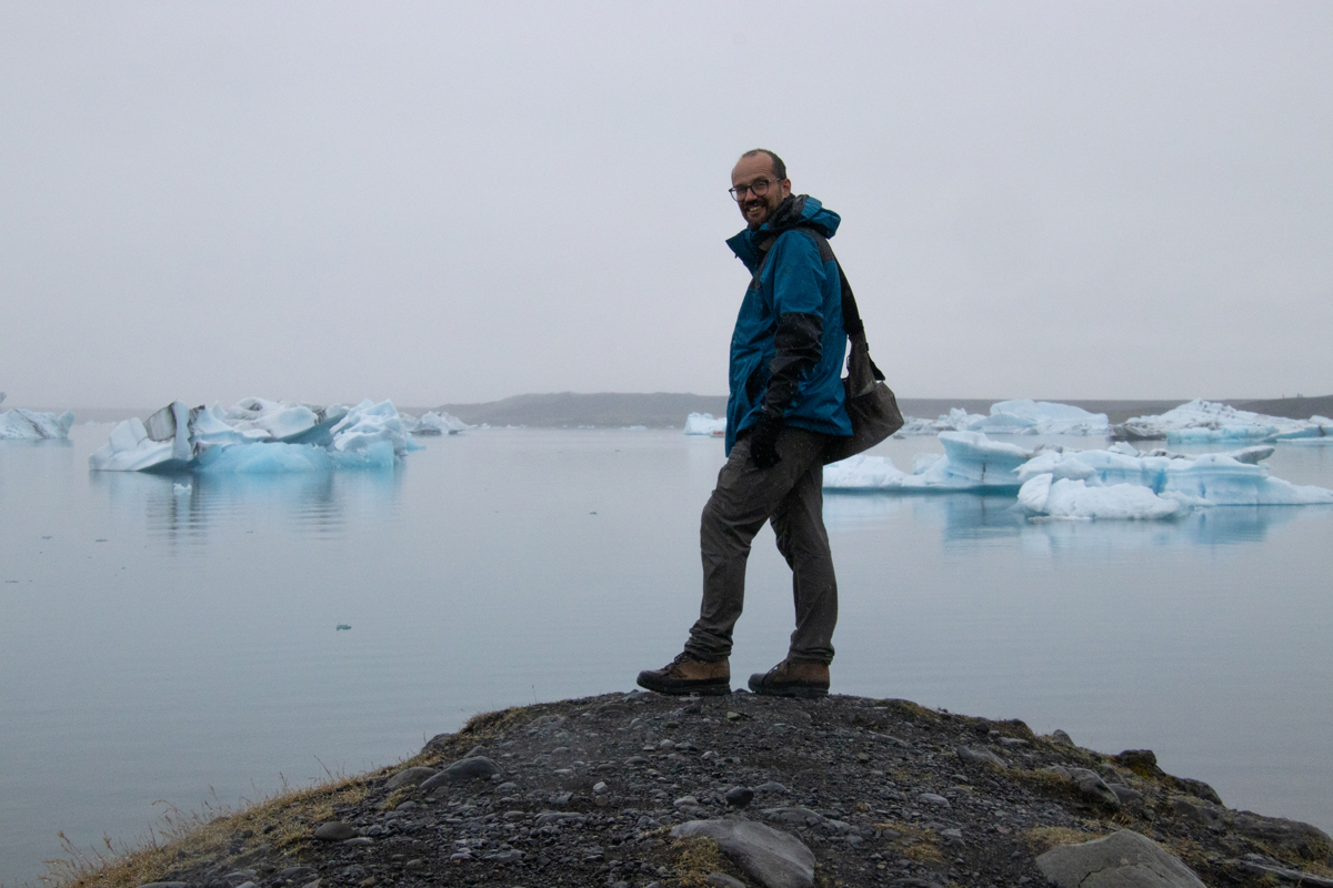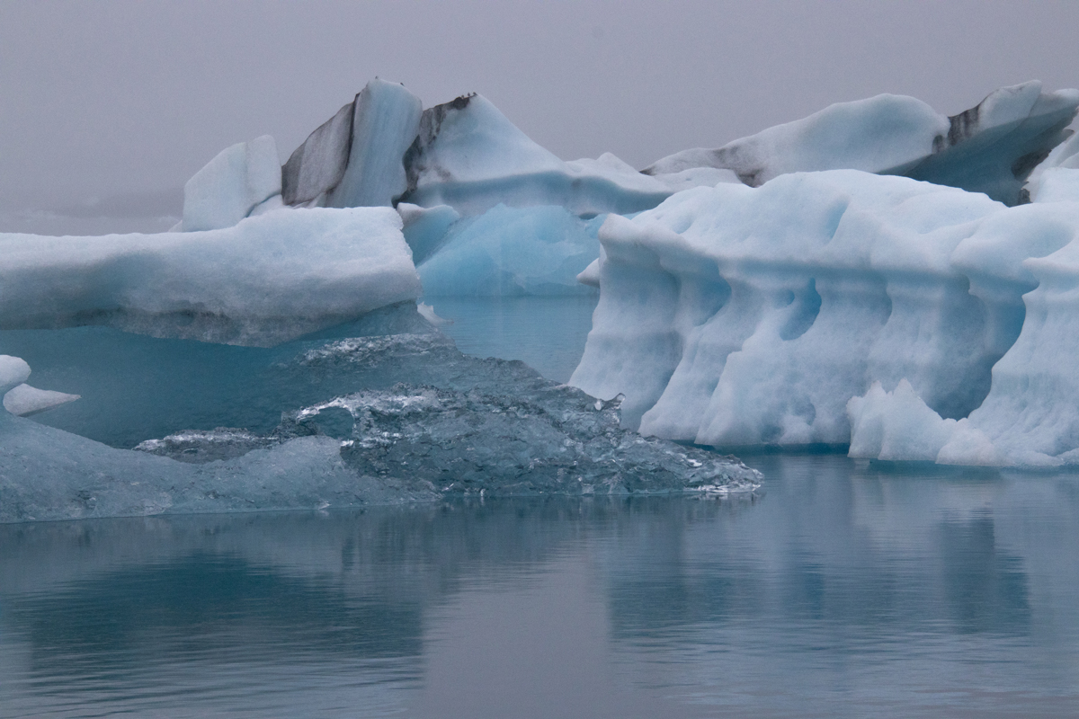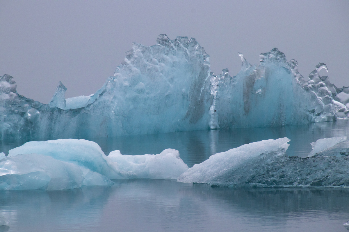 Vanaf het strand heb je zicht op de blauw-witte ijsschotsen die je van Jökulsárlón kent, die langzaam langs drijven.