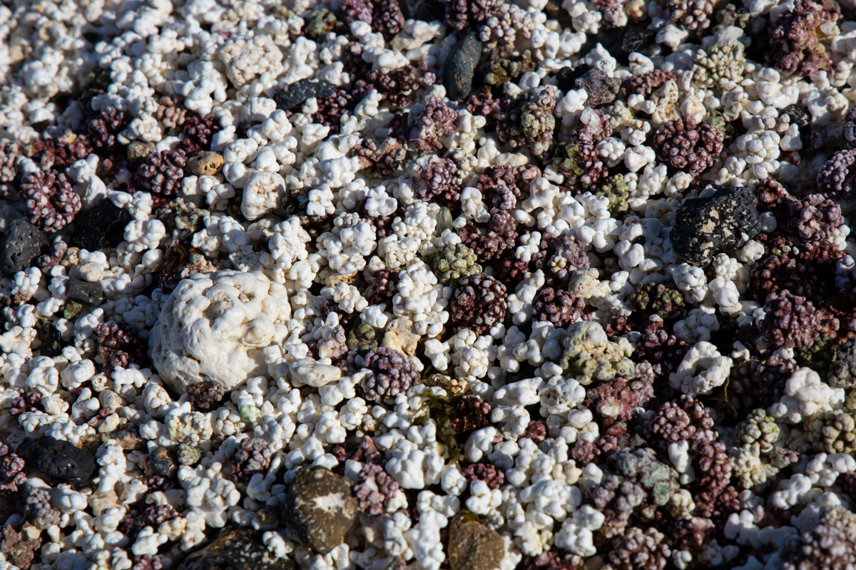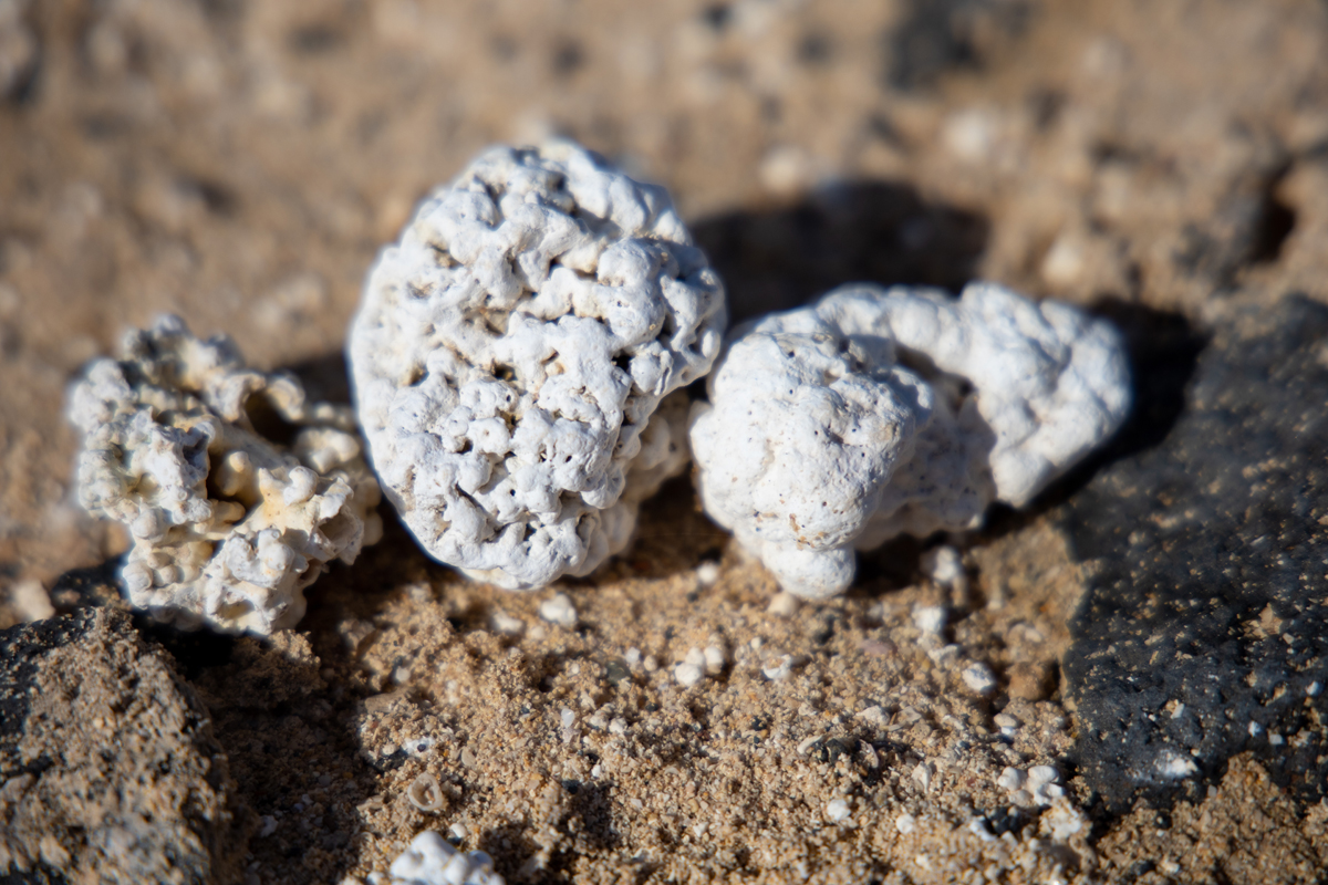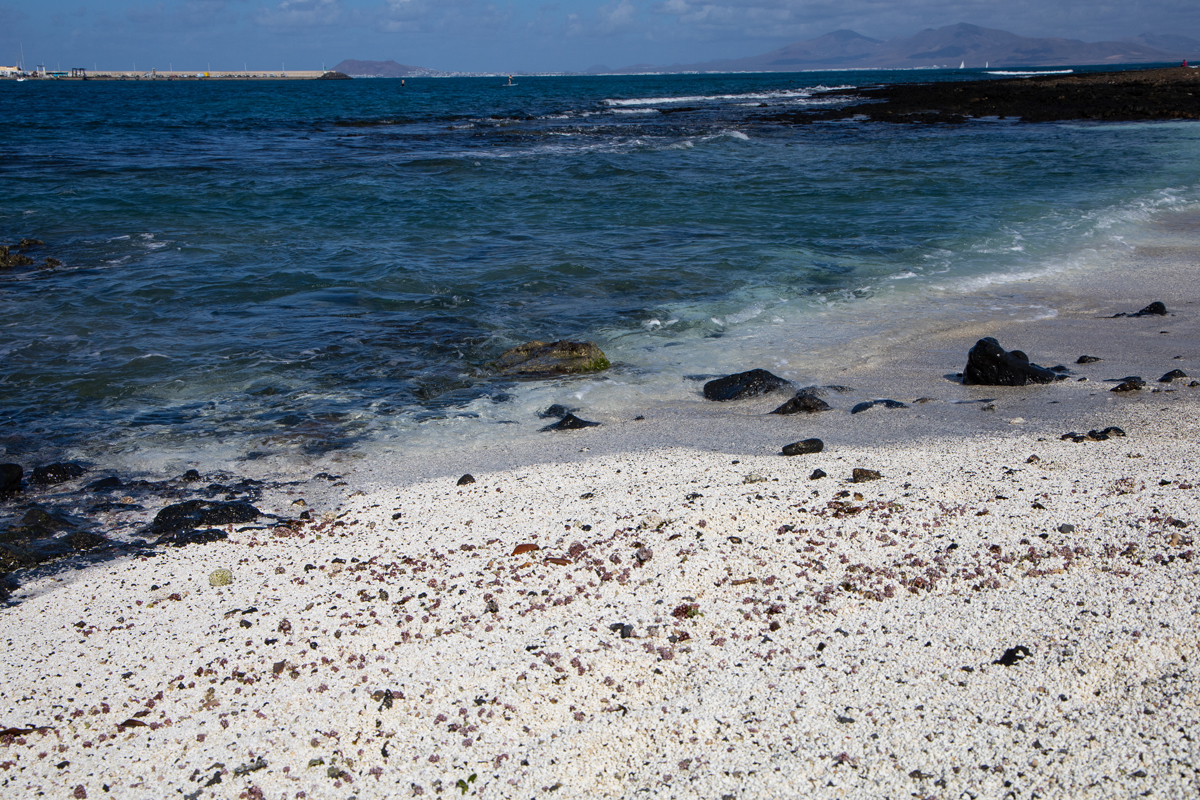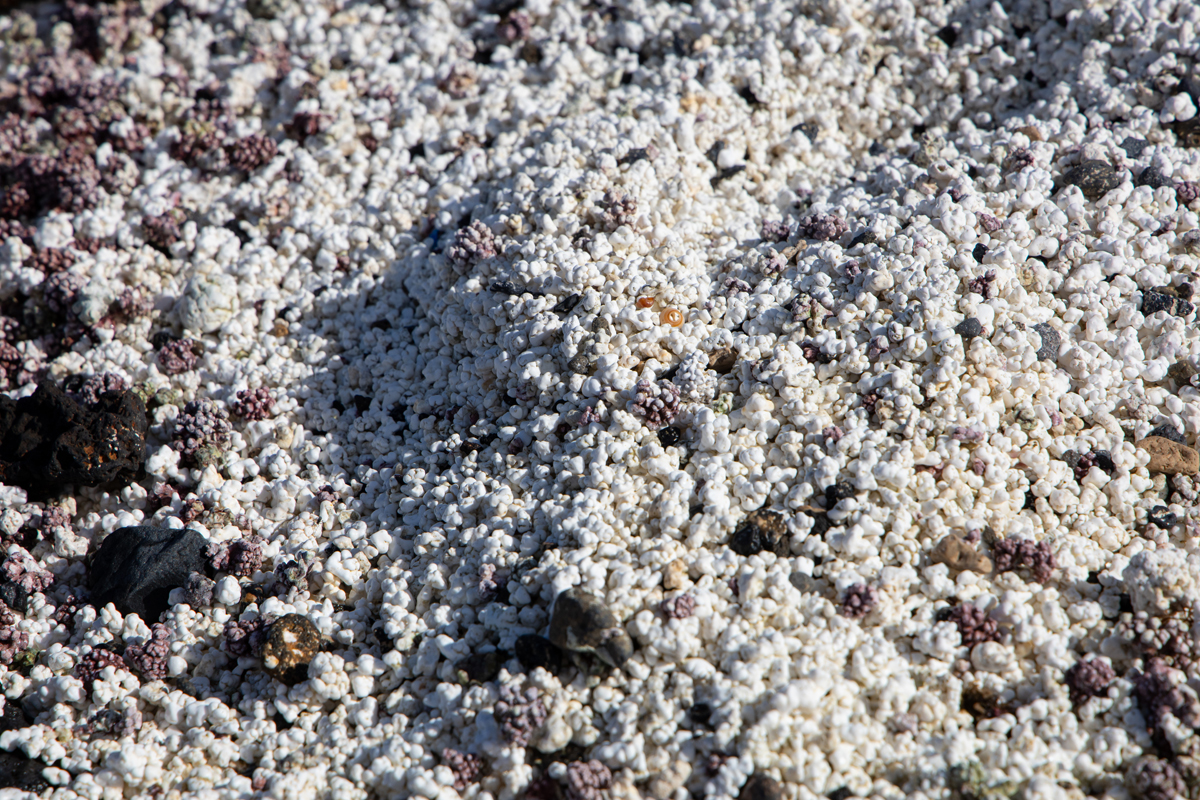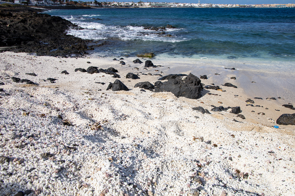 We hebben het over ‘Playa del Bajo de la Burra’ een strandje in het noorden van het Canarische eiland Fuerteventura, dat in de volksmond bekend staat als ‘Popcorn Beach’. De ‘popcorn’ bestaat uit duizenden kleine, witte fossielen van kalkalgen, zogenaamde ‘rhodolieten’. Deze algen groeien langzaam – eeuwen! – op de zeebodem en worden na hun leven naar de kust gedreven, waar ze met elkaar dit bijzondere strand vormen.