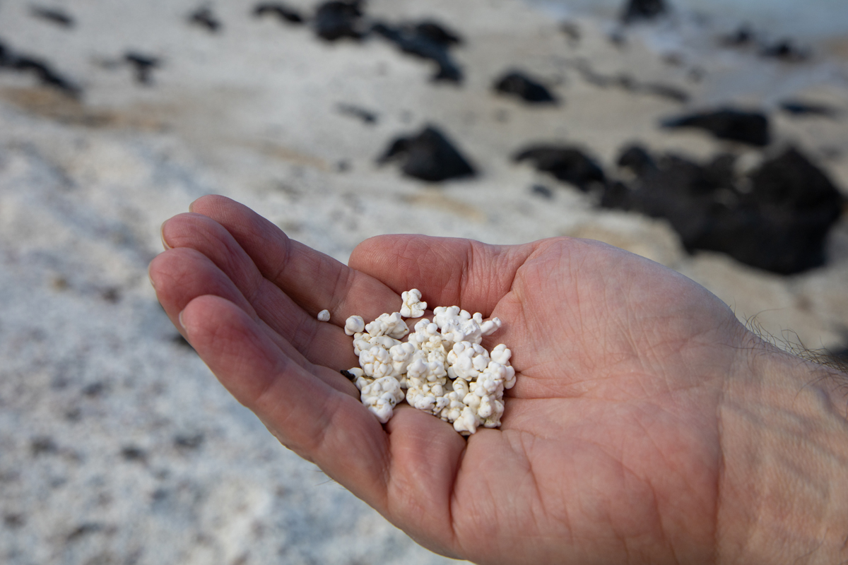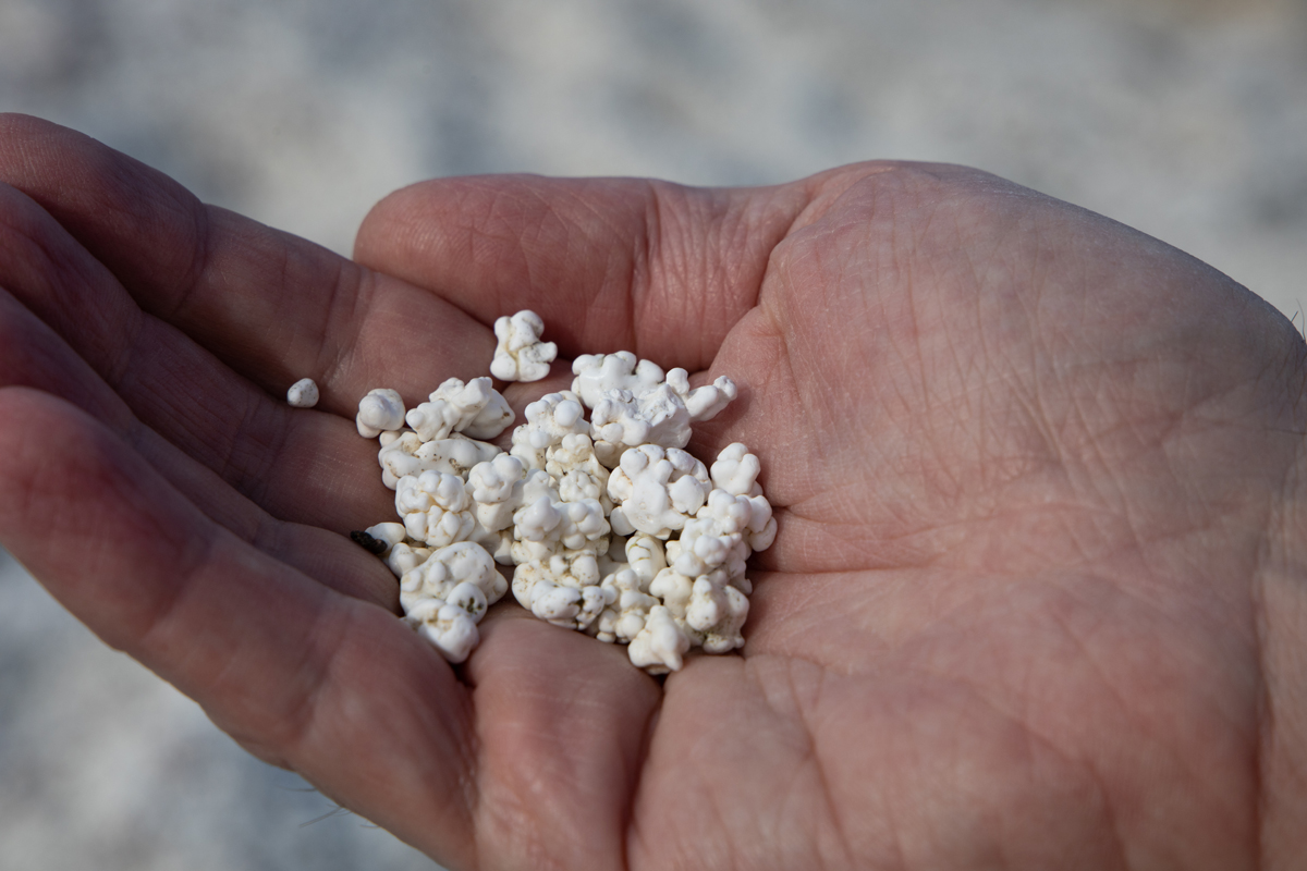 Op het eerste gezicht denk je dat iemand een gigantische zak popcorn heeft uitgestrooid over het strand, maar niets is minder waar: dit is geen paradijs voor snackgrage bioscoopbezoekers, maar een bijzonder natuurfenomeen.